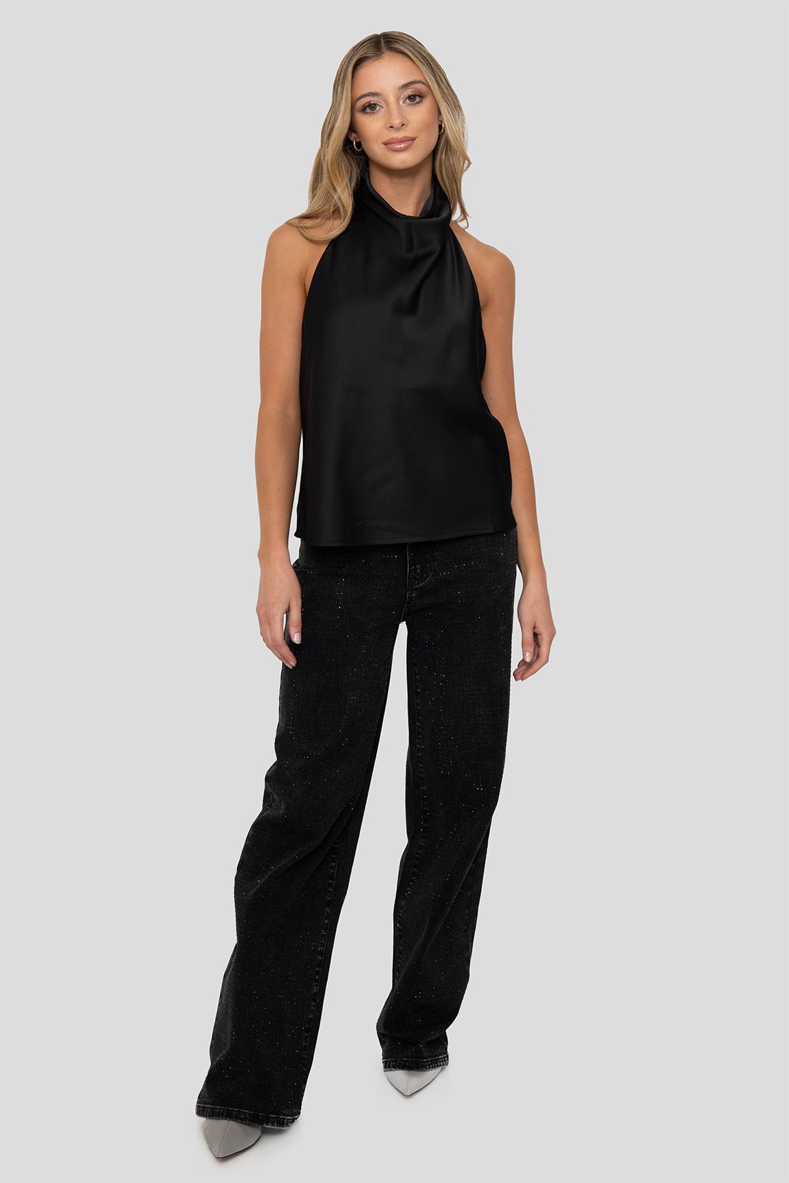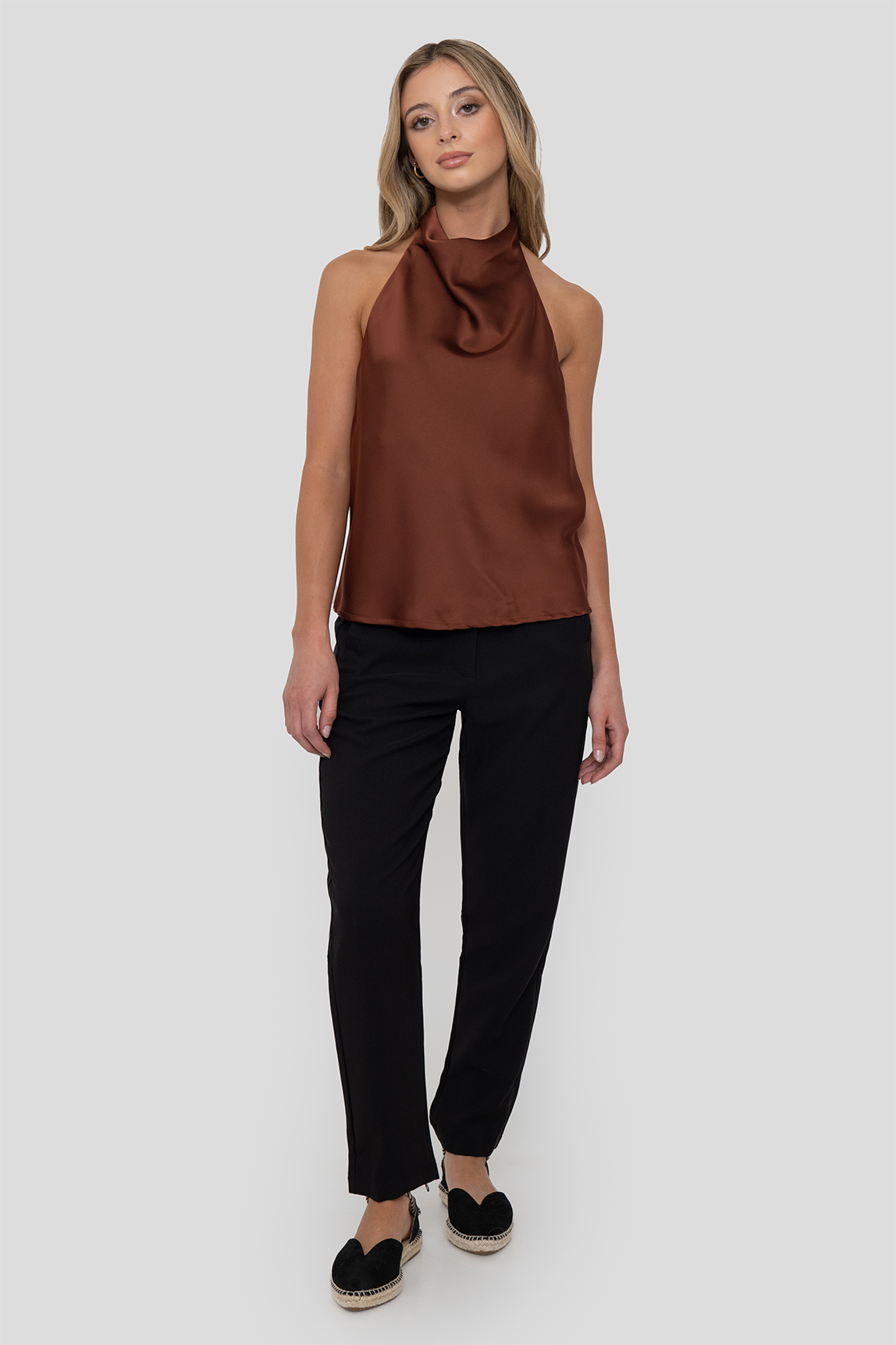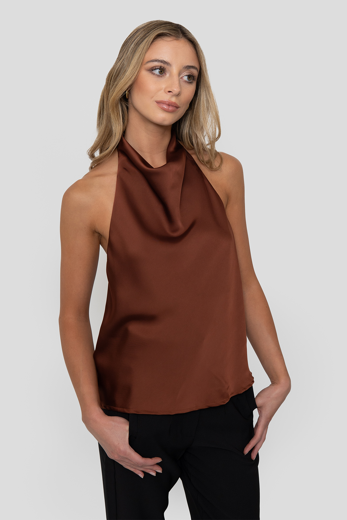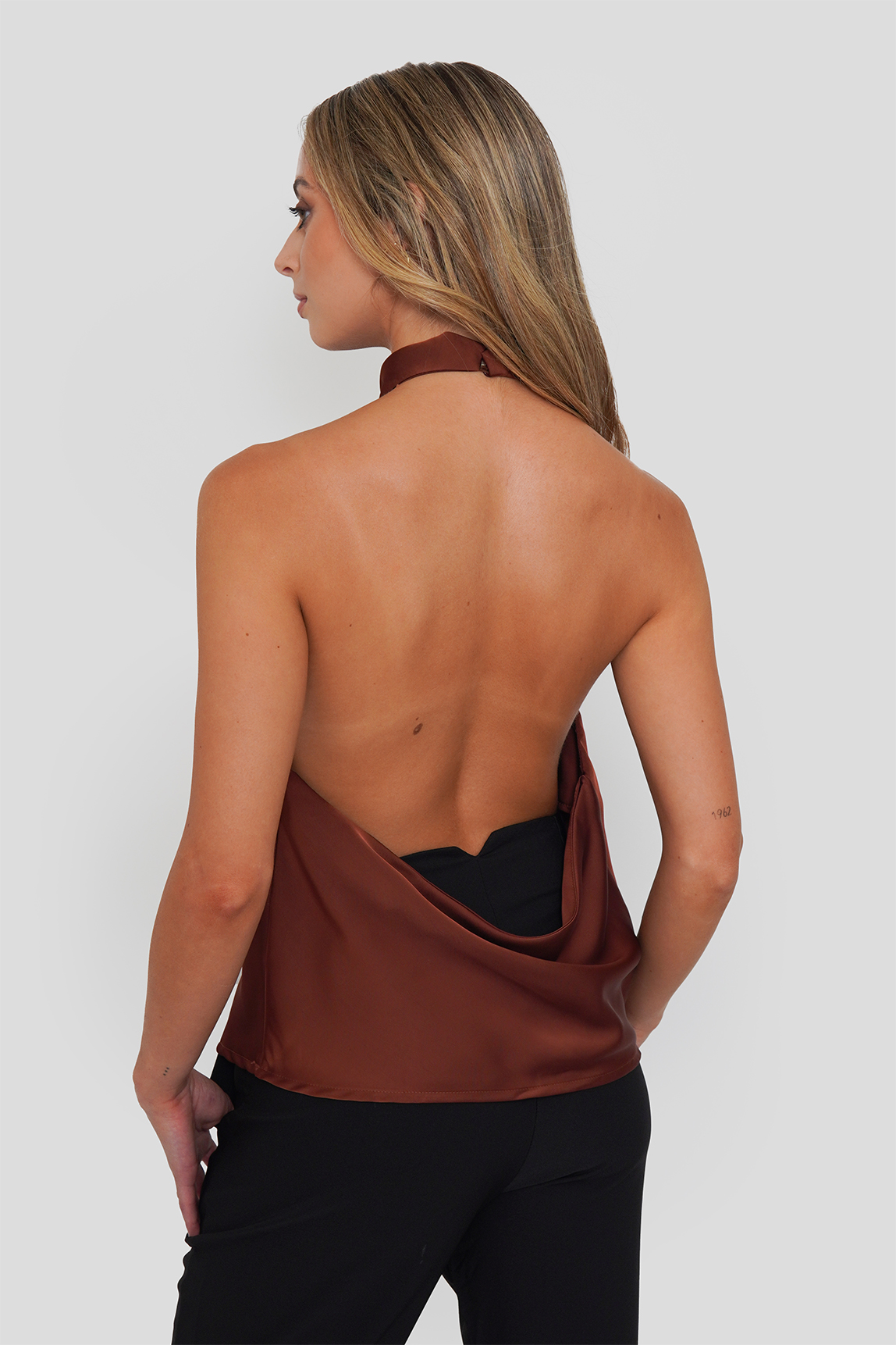 Blusa halter de satín con caída suave y brillo elegante. Diseño con escote drapeado al cuello que realza la silueta, ideal para looks de noche, eventos o outfits sofisticados de día. Tela liviana y fluida que aporta comodidad y estilo.