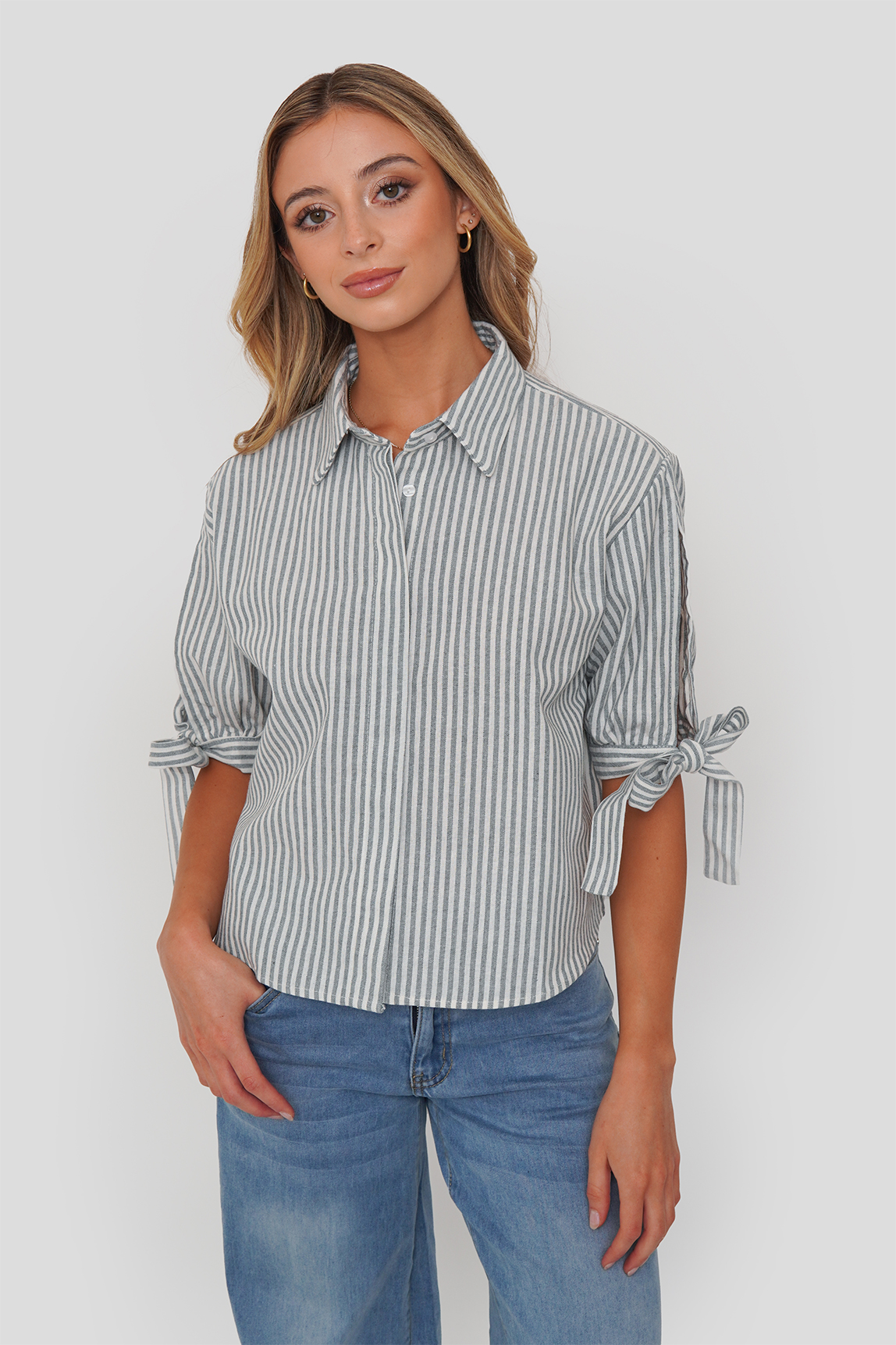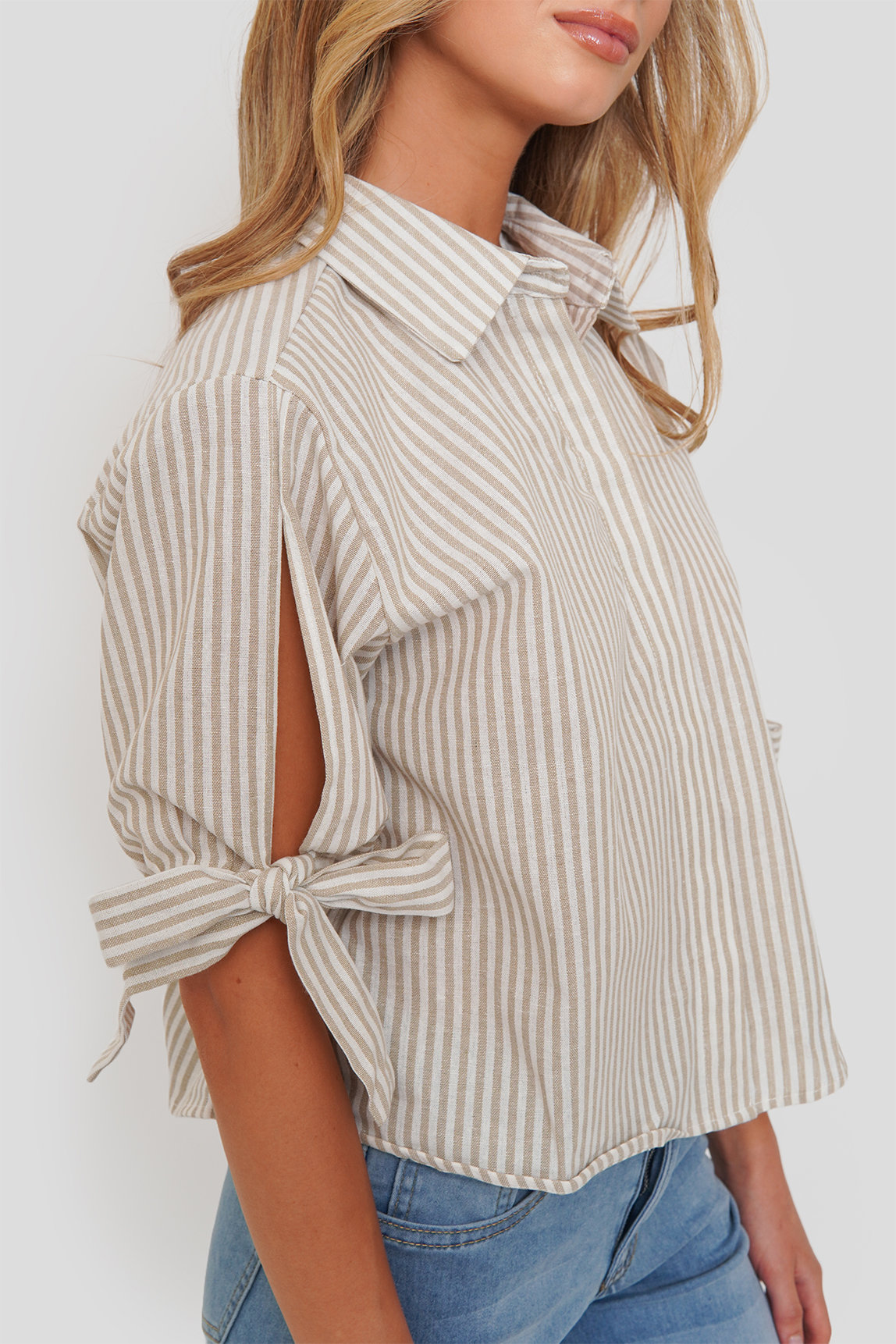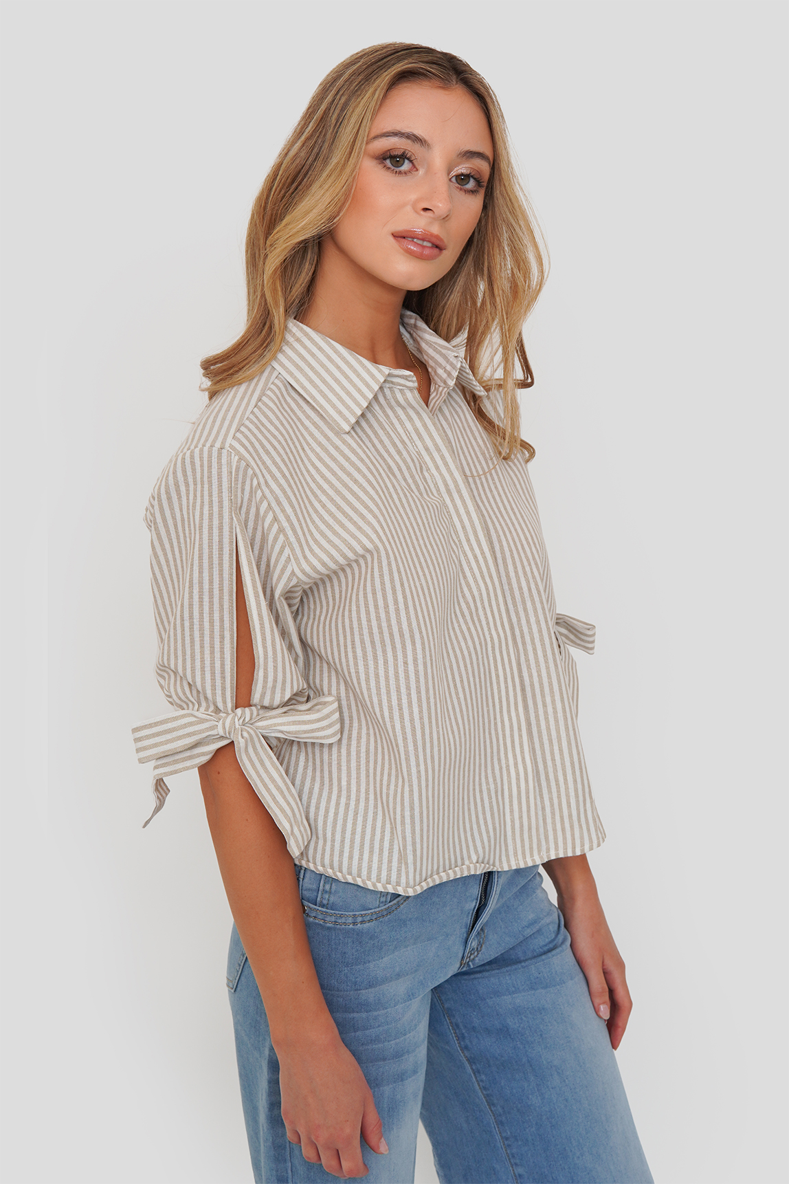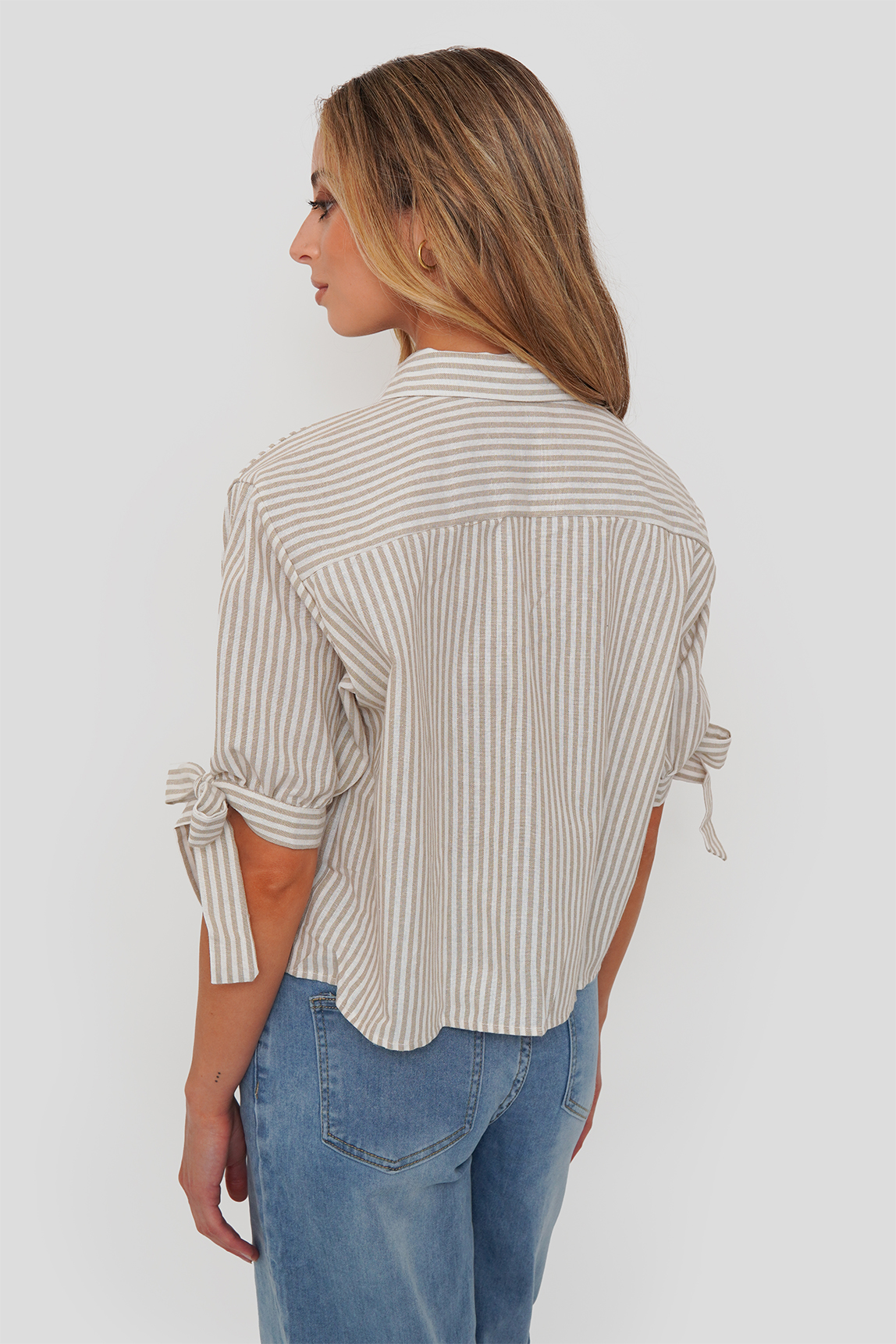 Blusa de lino a rayas con detalle de lazos en los puños. Diseño fresco y femenino, ideal para looks casuales elegantes.