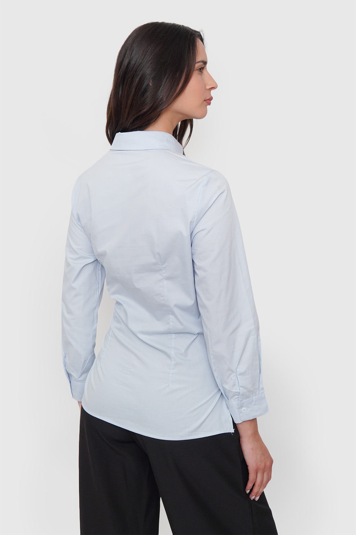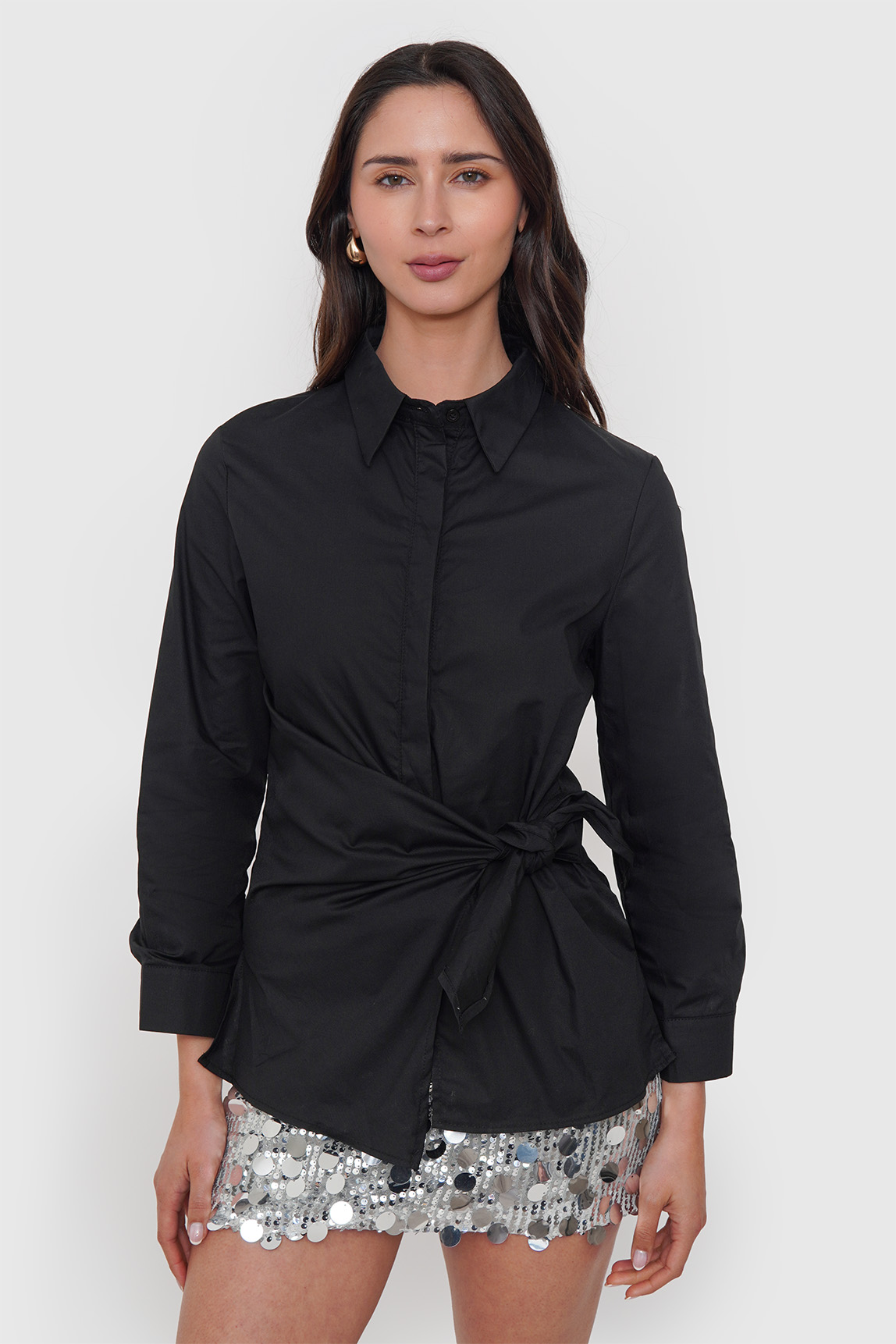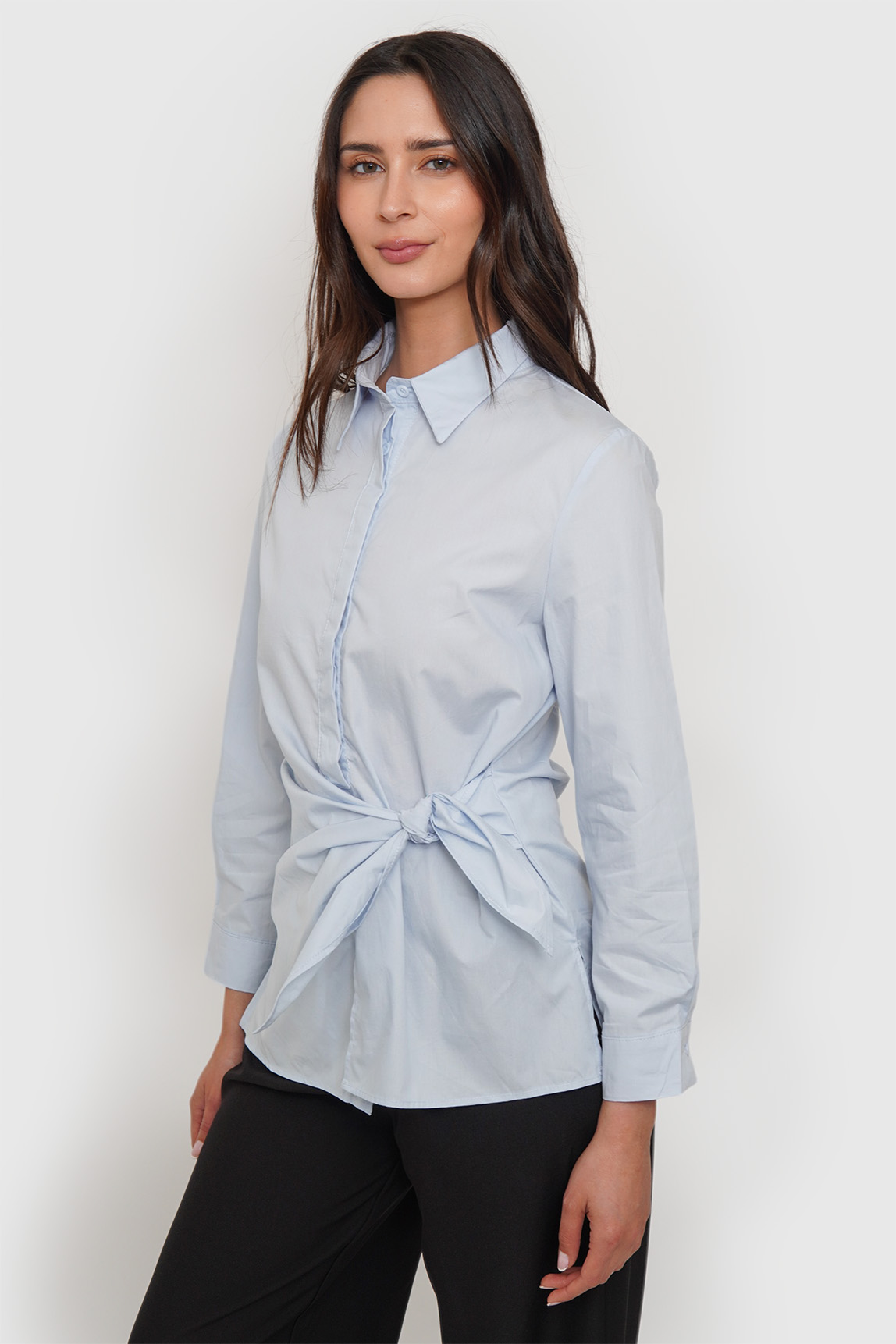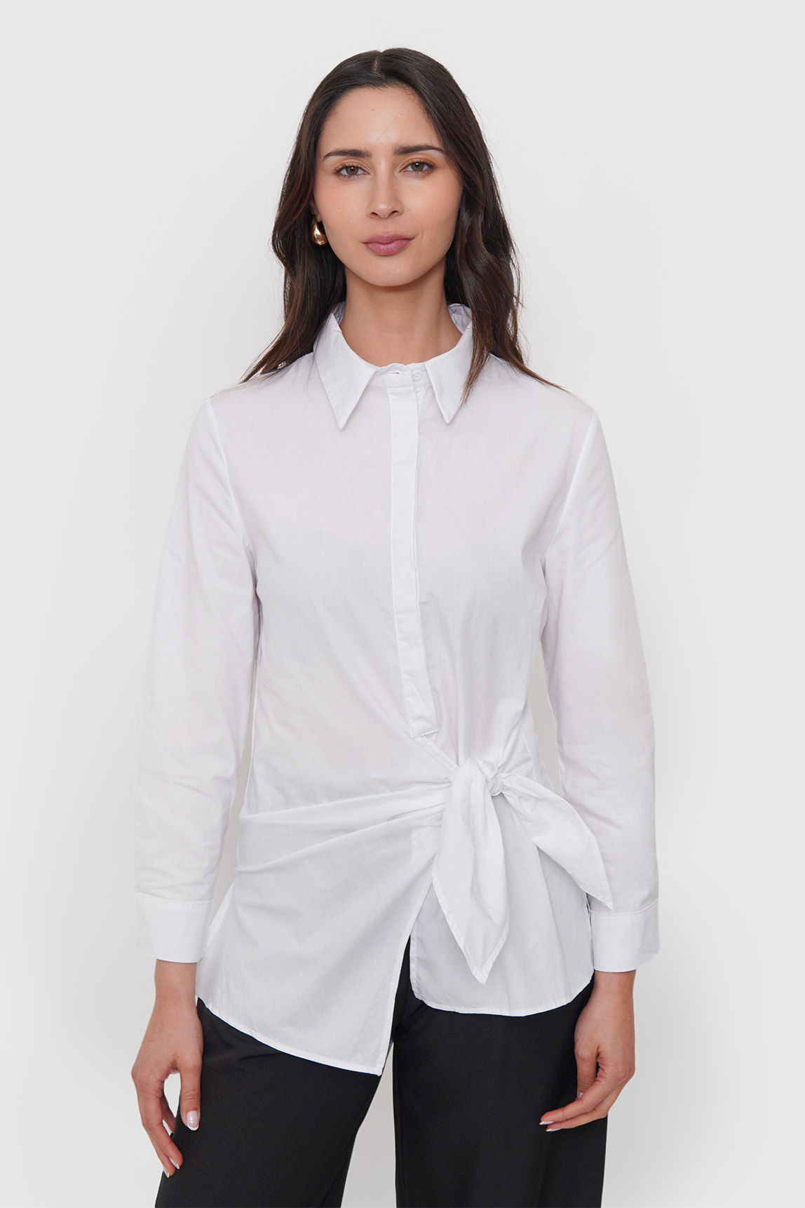 Blusa de manga larga con cuello camisero clásico y detalle de nudo frontal que aporta un toque moderno y femenino. Perfecta para looks de oficina o casual chic.