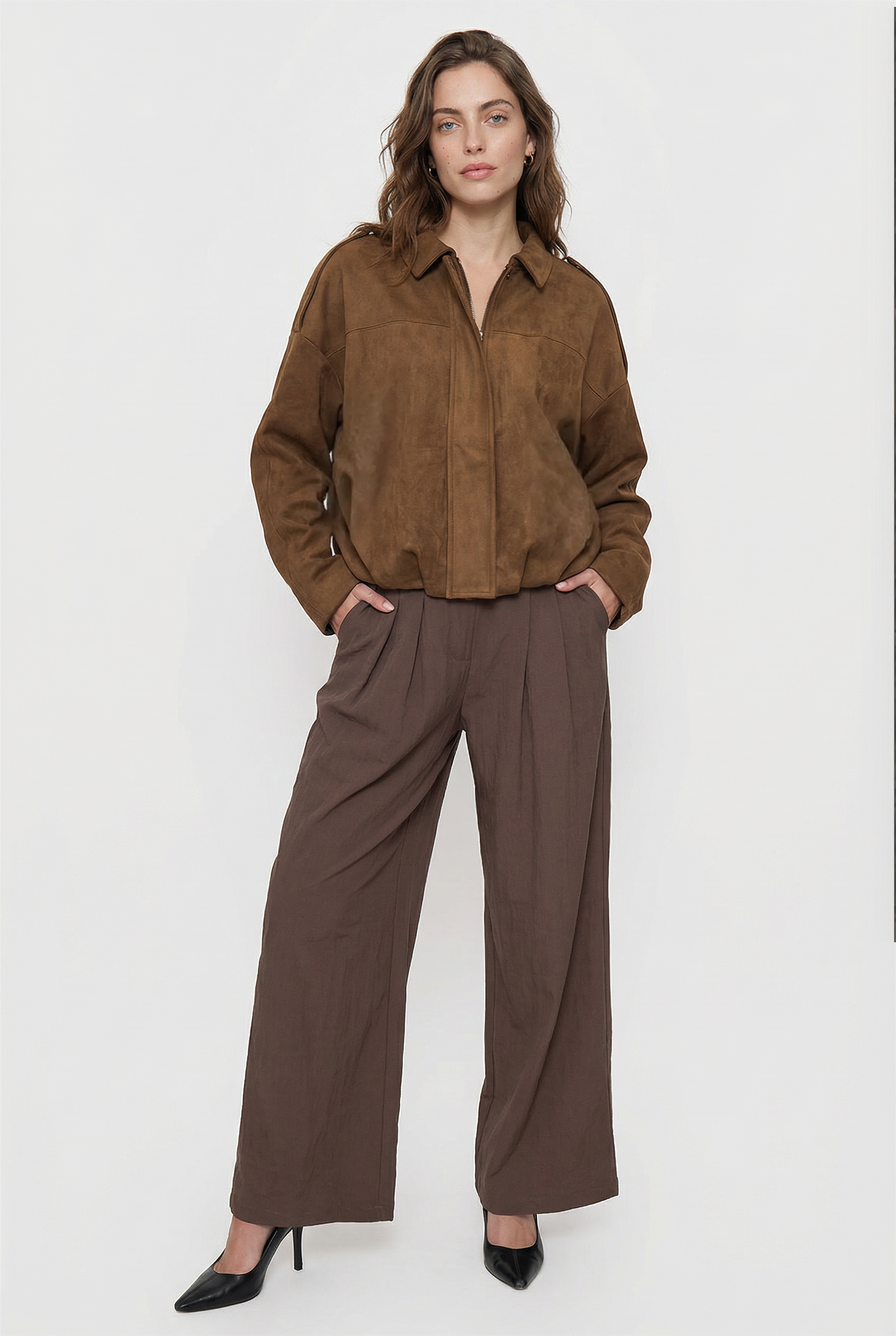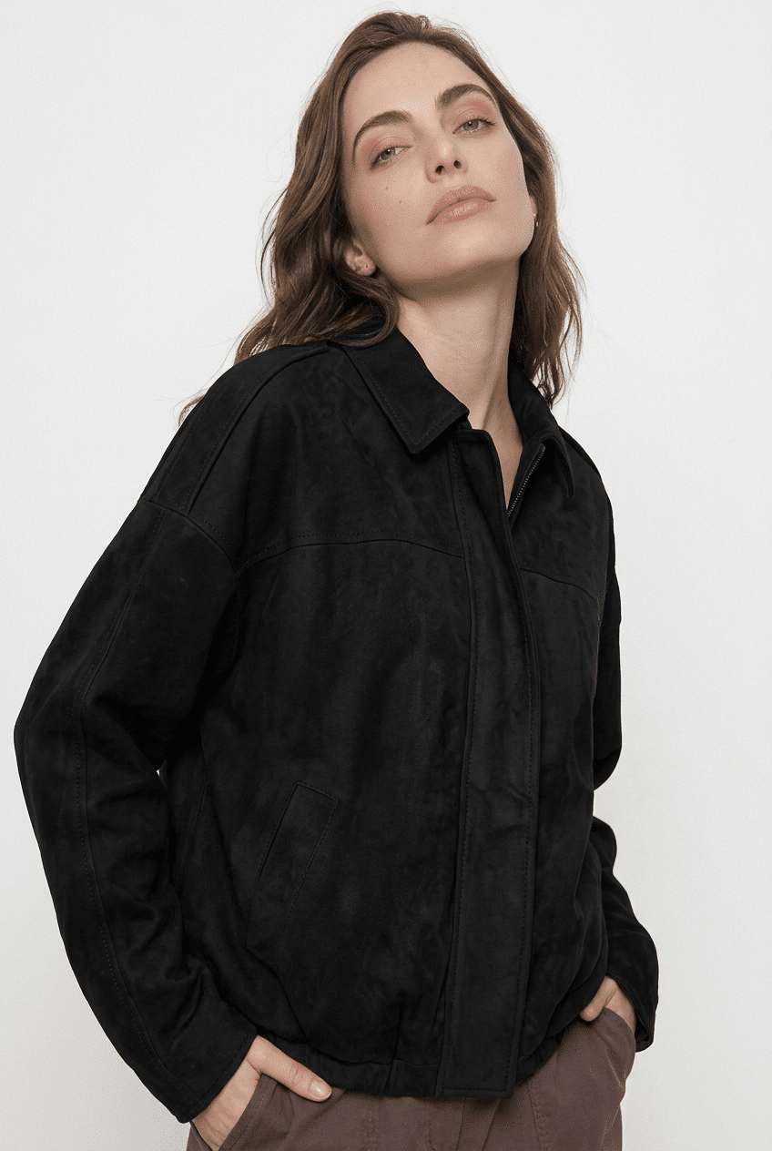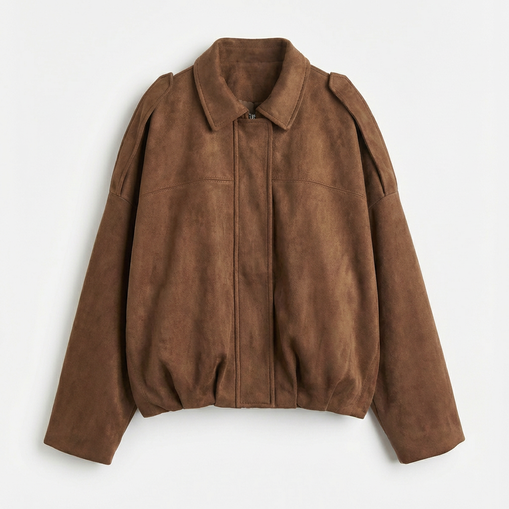 Chaqueta de corte amplio y holgado con acabado en gamuza. Este modelo viene totalmente forrado para mayor confort y abrigo. Su diseño oversize con cuello camisero y puños elasticados ofrece un look contemporáneo, versátil y sofisticado para cualquier ocasión.