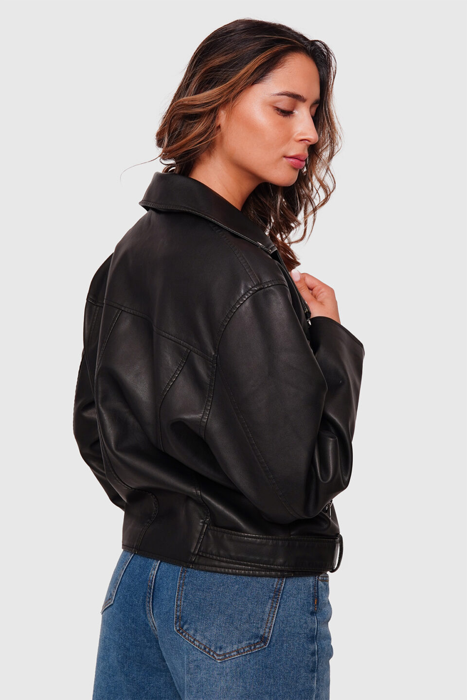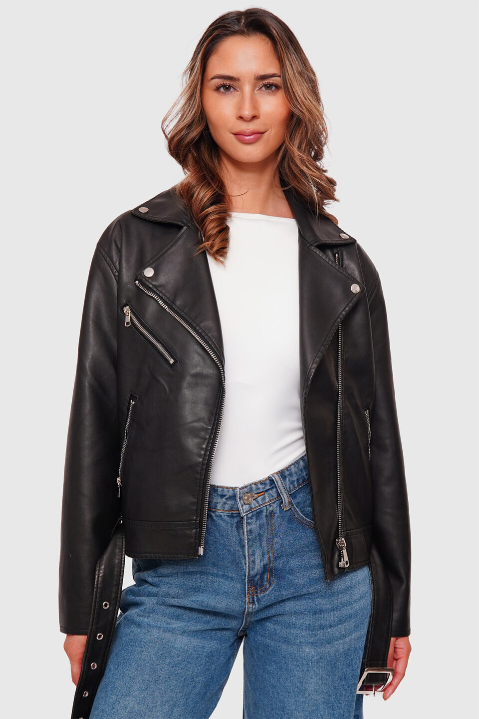 Una chaqueta de mezclilla corta con un diseño moderno y ajustado, perfecta para destacar cualquier look. Su tejido elástico proporciona comodidad y un ajuste favorecedor, mientras que el cierre frontal con detalle de aro le da un toque sofisticado y urbano.