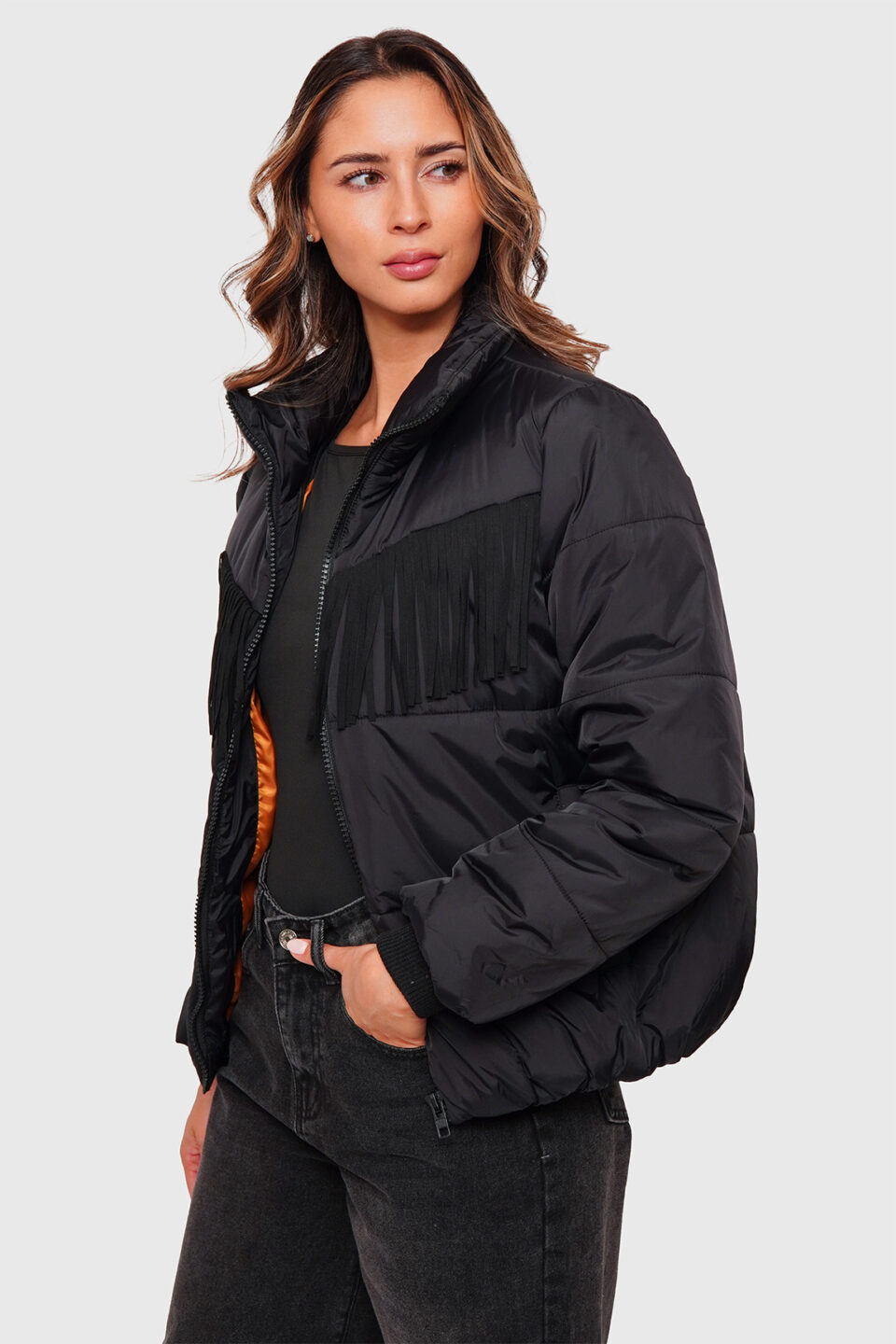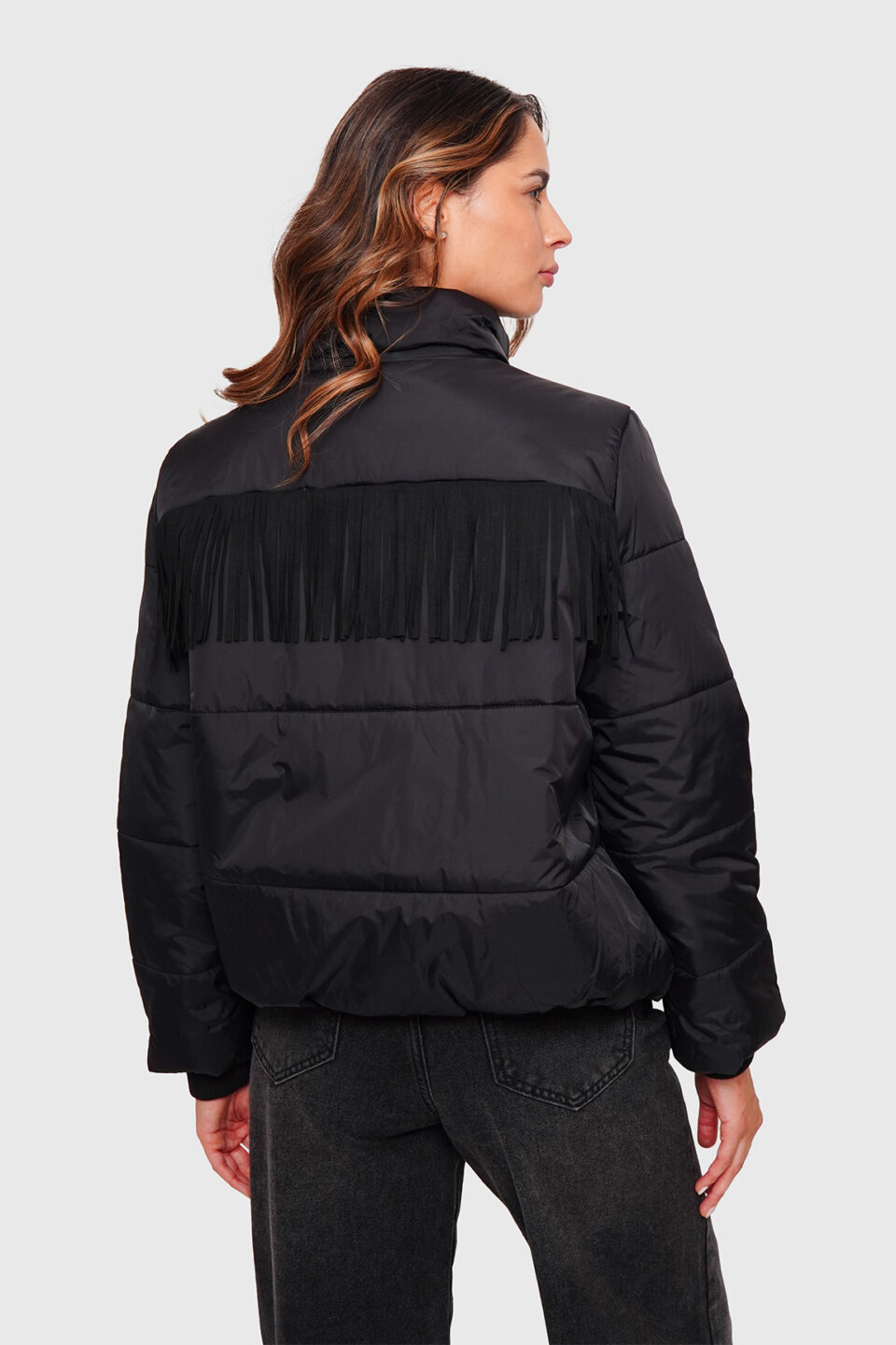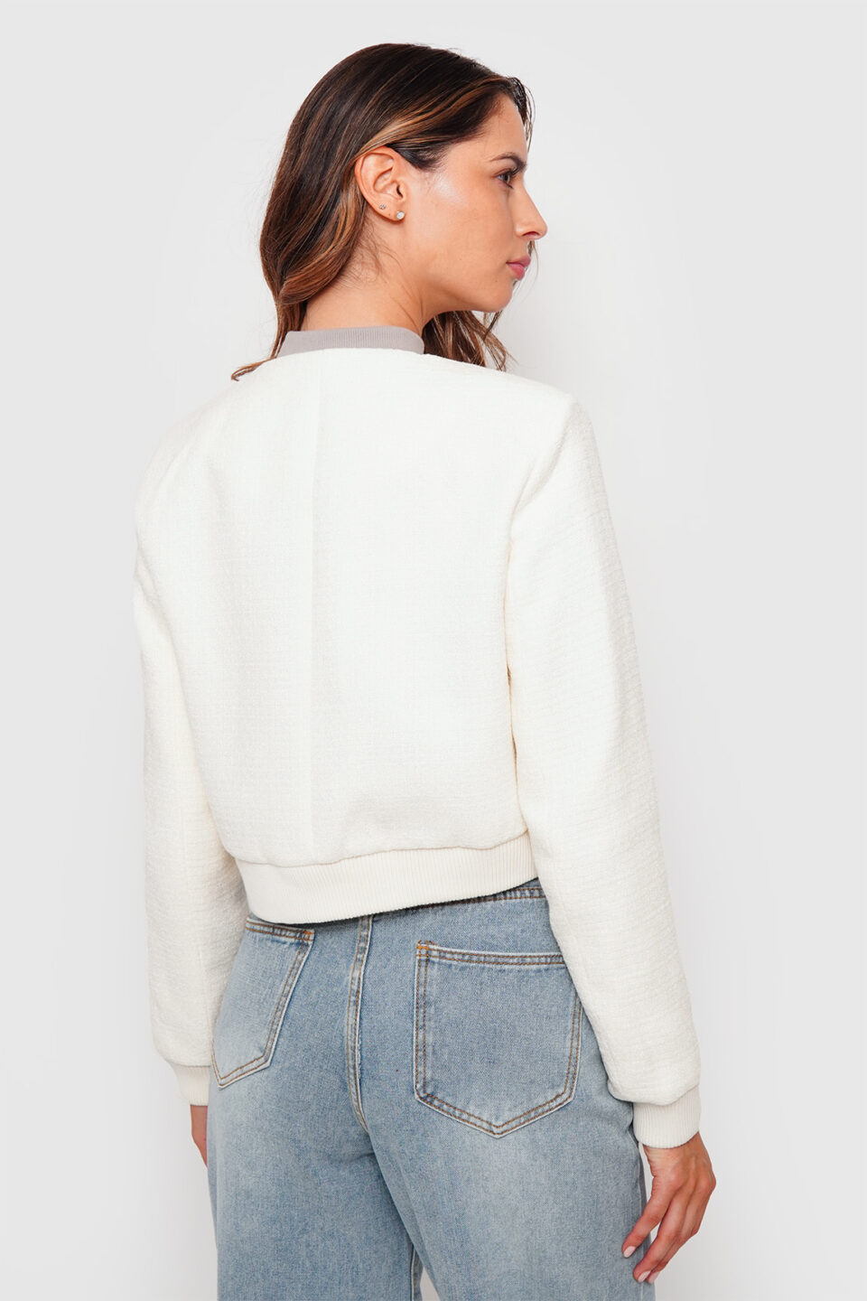 - Diseño : Chaqueta corta con botones metálicos al frente, bolsillos en el pecho y corte ajustado para un look juvenil y estilizado. Las aplicaciones de strass en la parte posterior le brindan un estilo único y llamativo.