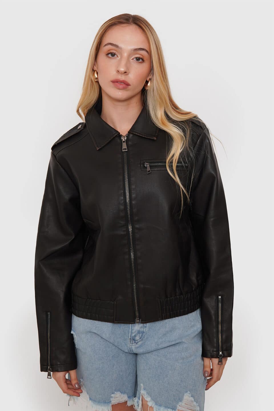 Chaqueta de piel sintética con textura suave, forro completo y cierre frontal, perfecta para abrigarse con estilo.