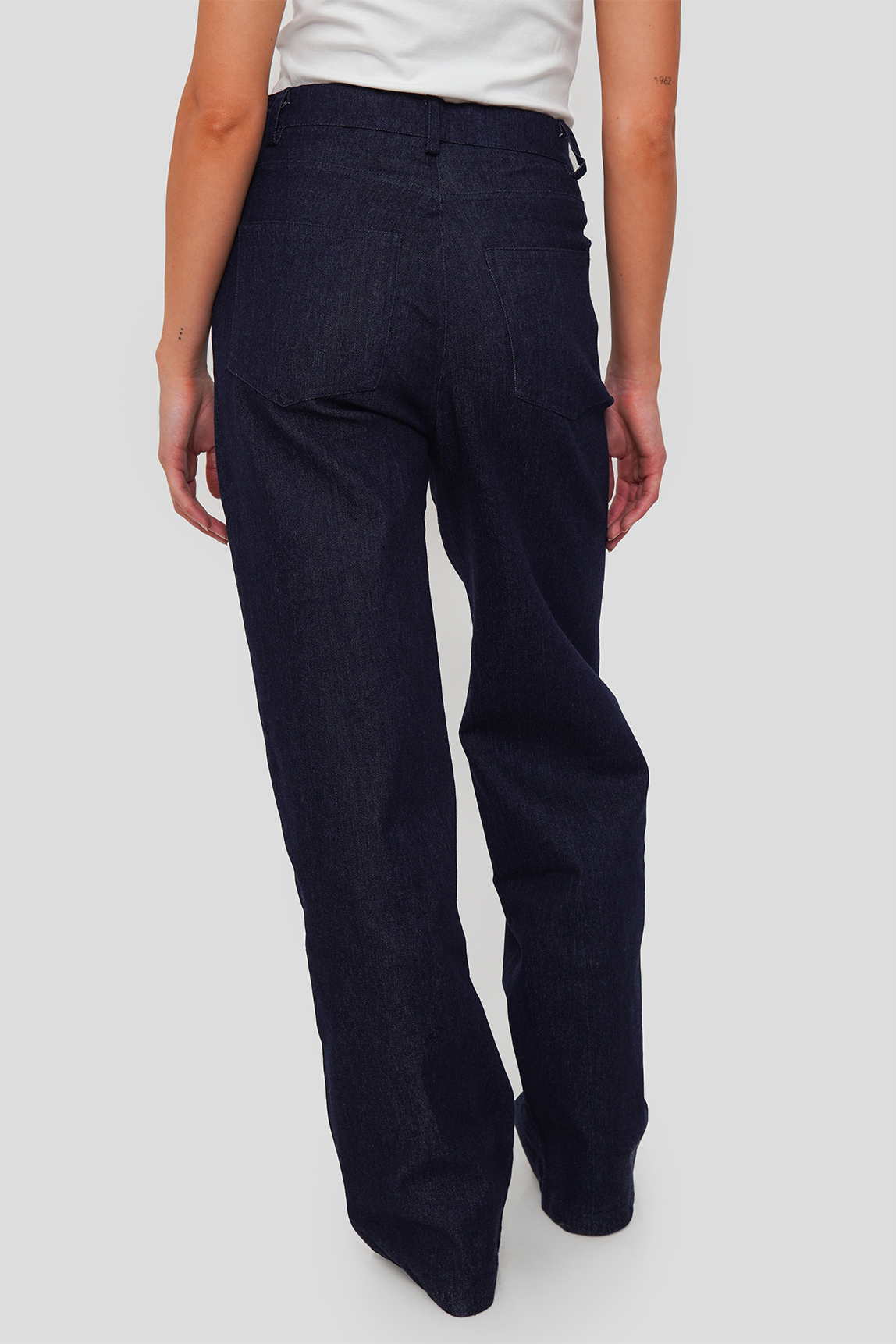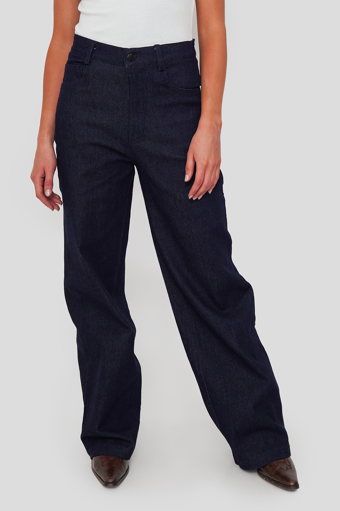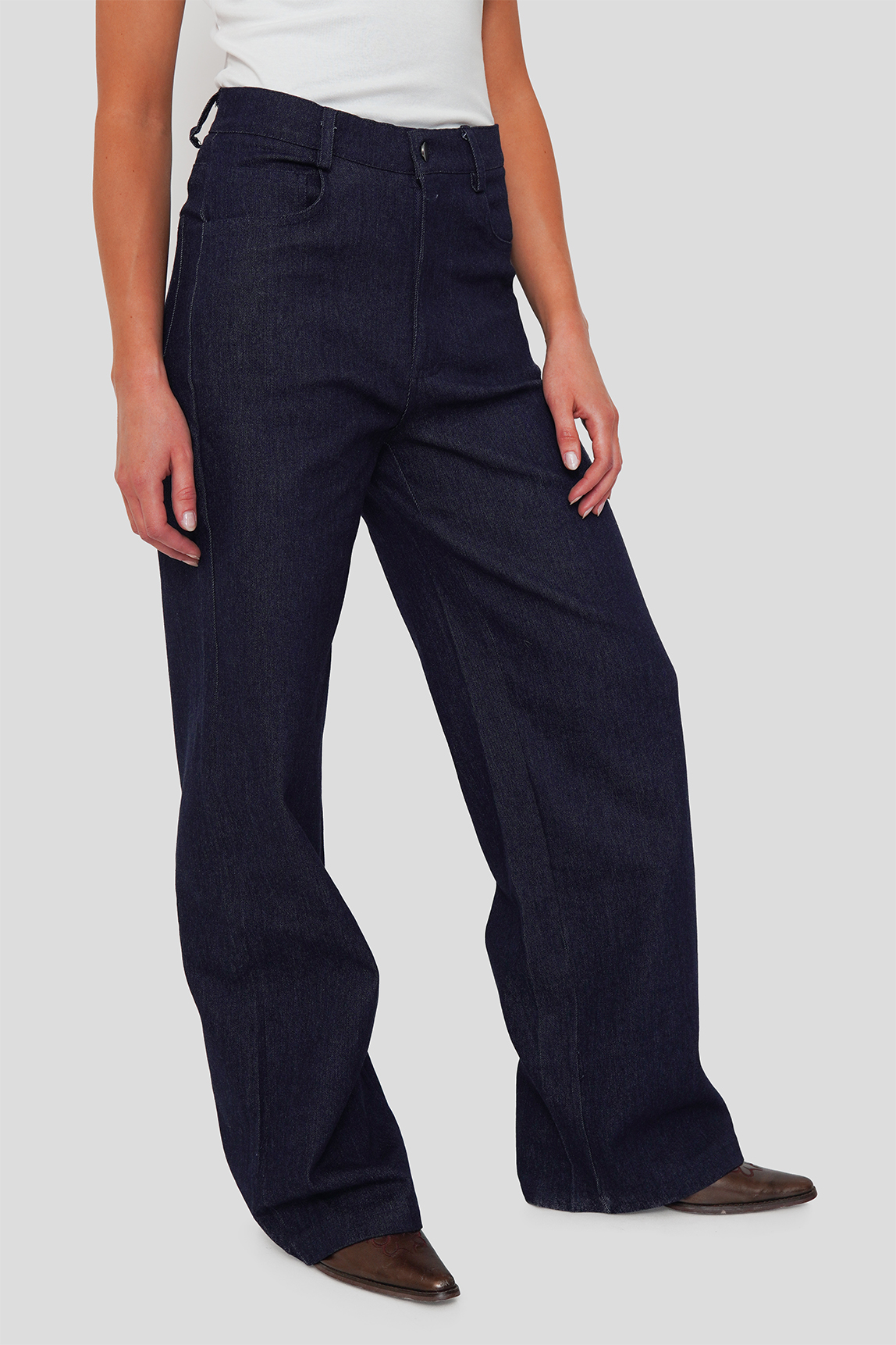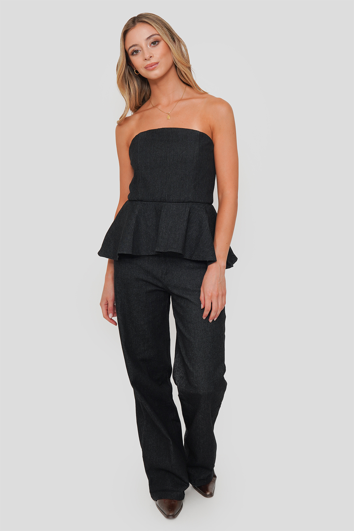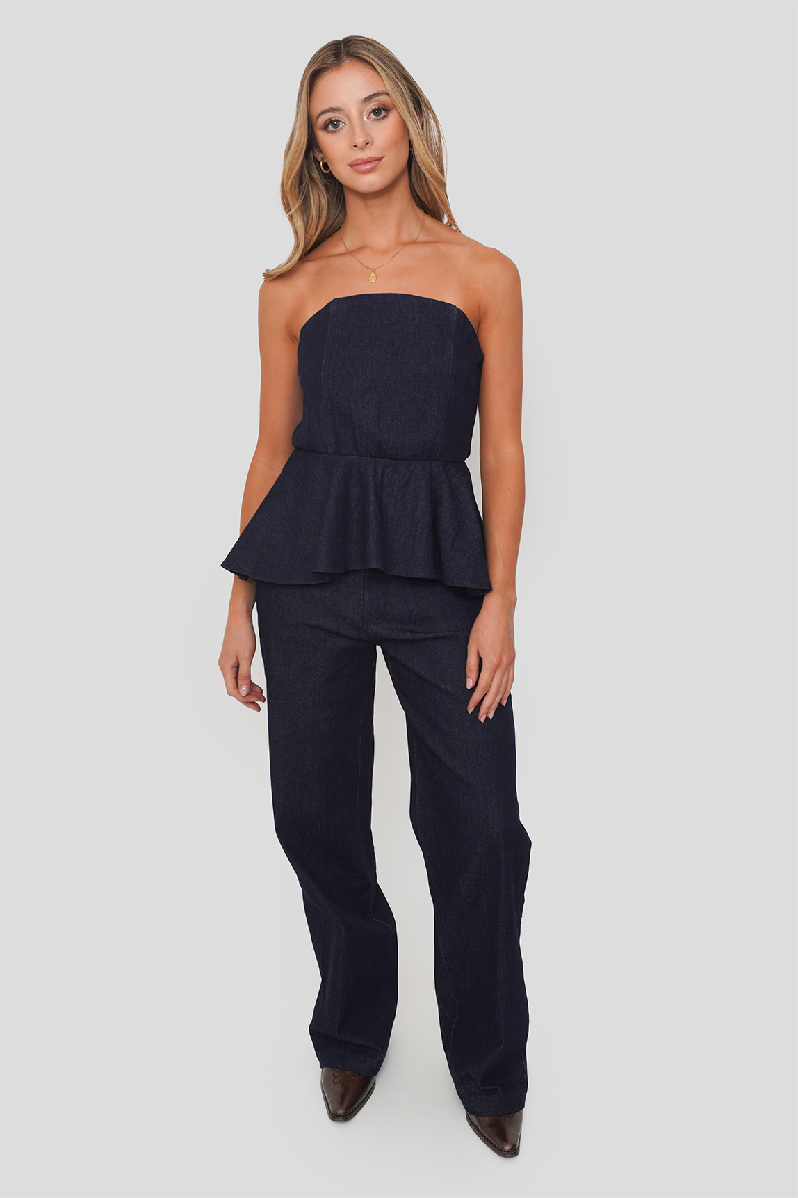 Conjunto de top strapless con vuelo y pantalón de tiro alto. Denim elasticado que combina comodidad y estilo.