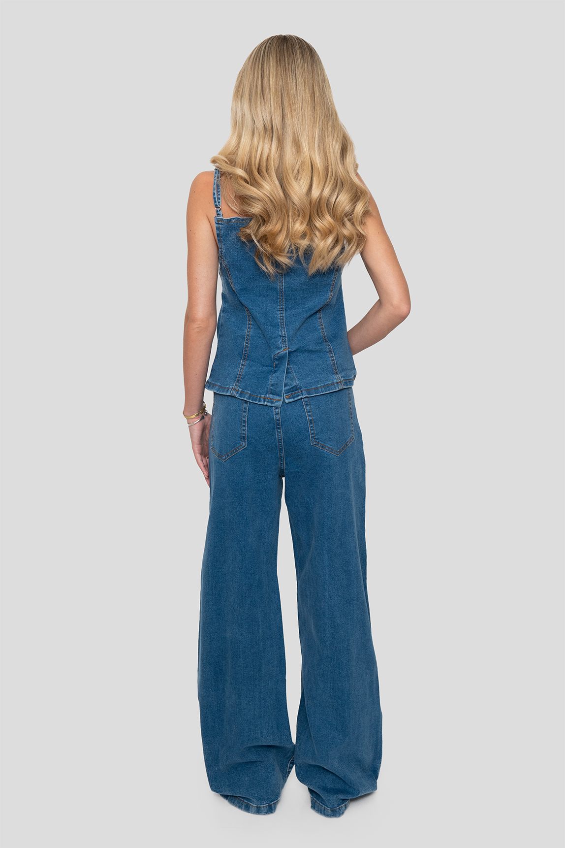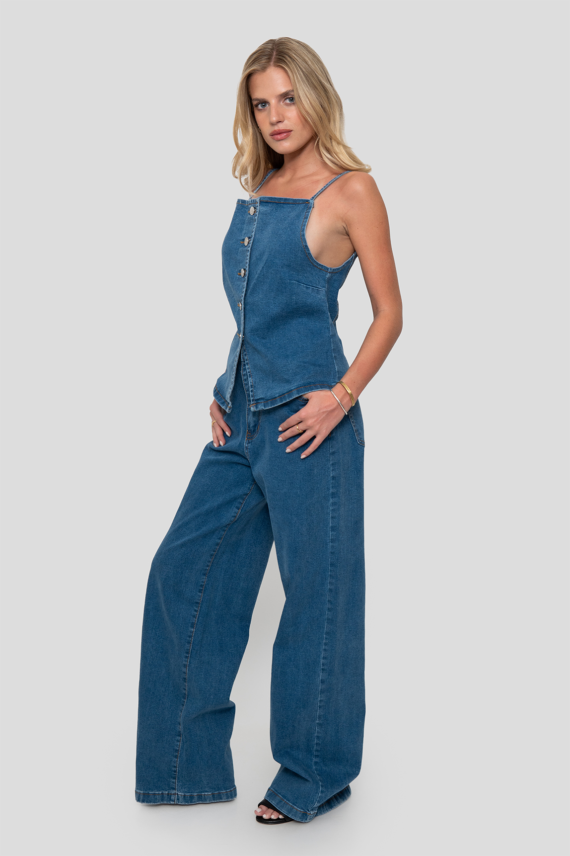 Conjunto de dos piezas confeccionado en denim elasticado que combina un top ajustado con tirantes y botón frontal, junto a un pantalón de pierna recta y tiro medio. Diseño moderno y versátil que se adapta cómodamente al cuerpo, ideal para looks urbanos y casuales con estilo.