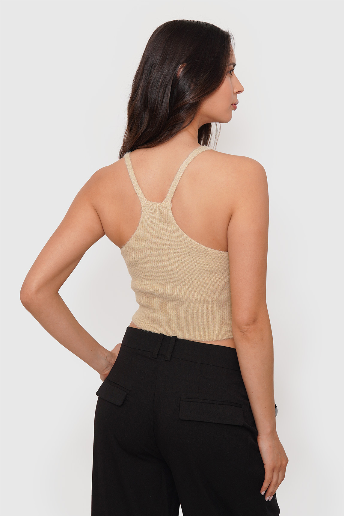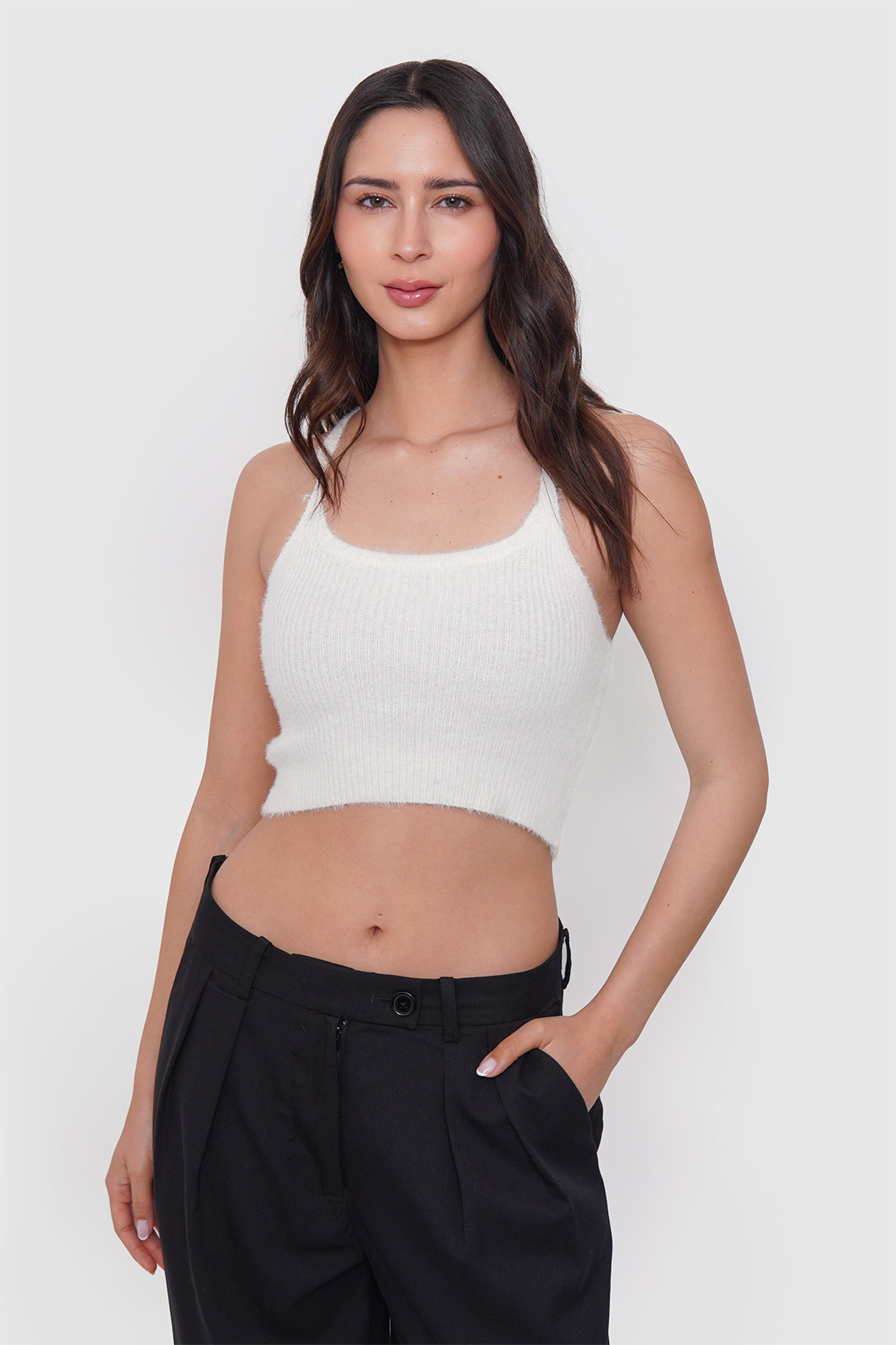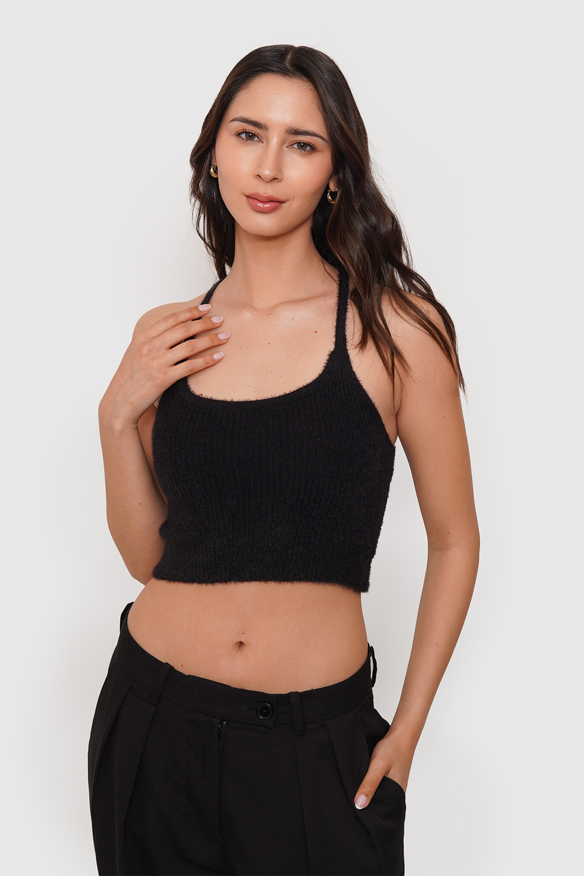 Crop top de tirantes delgados, tejido en angora suave con textura delicada y tacto cálido. Diseño ajustado que realza la figura, perfecto para usar solo o como prenda interior bajo chaquetas y sobrecamisas.