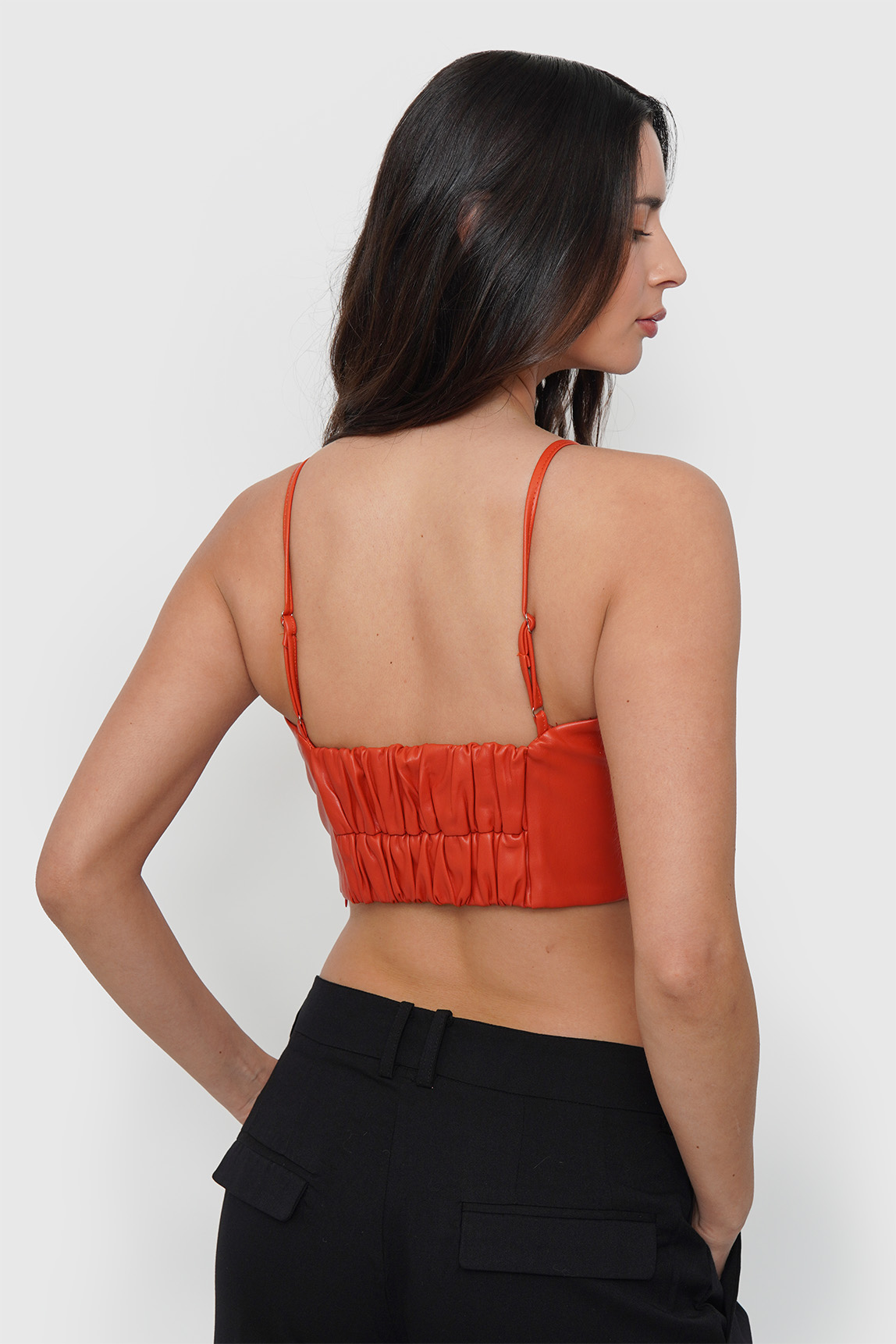 Crop top confeccionado en eco cuero con escote profundo en V y estructura ajustada al cuerpo. Su diseño moderno y atrevido lo convierte en un must-have para looks nocturnos y urbanos.