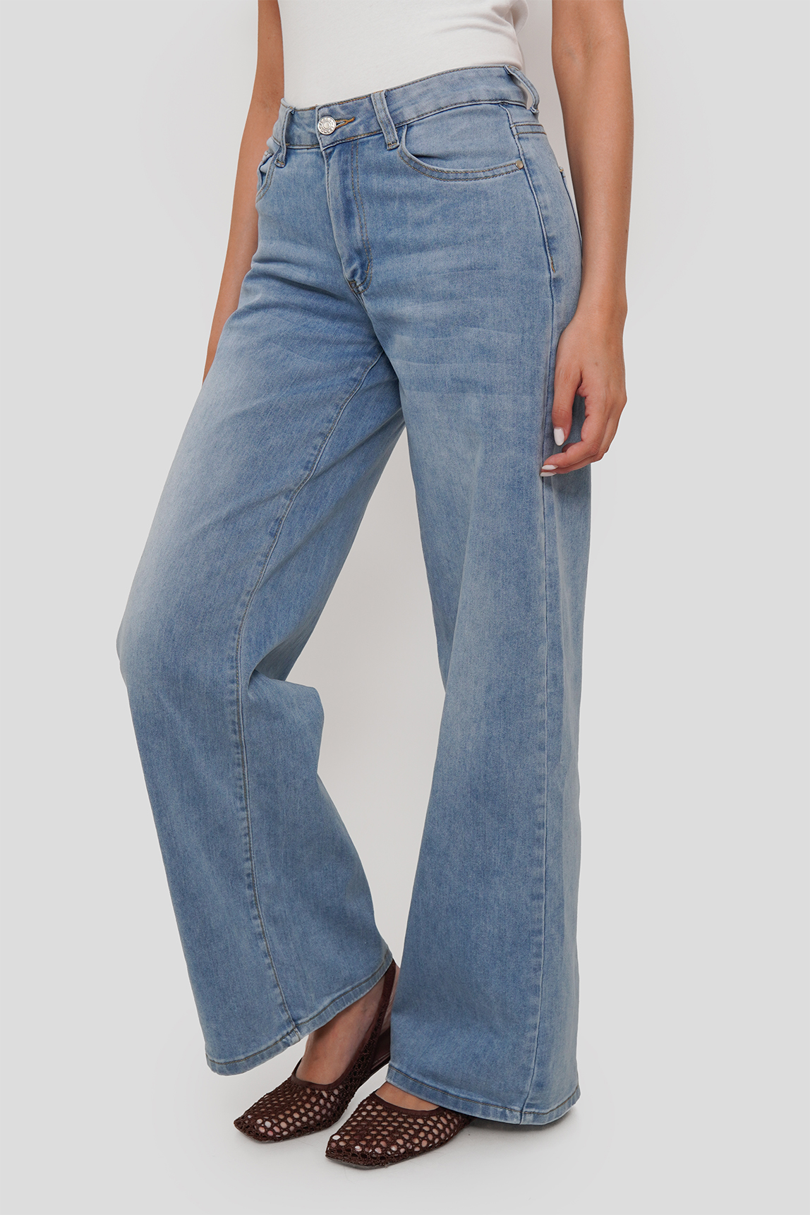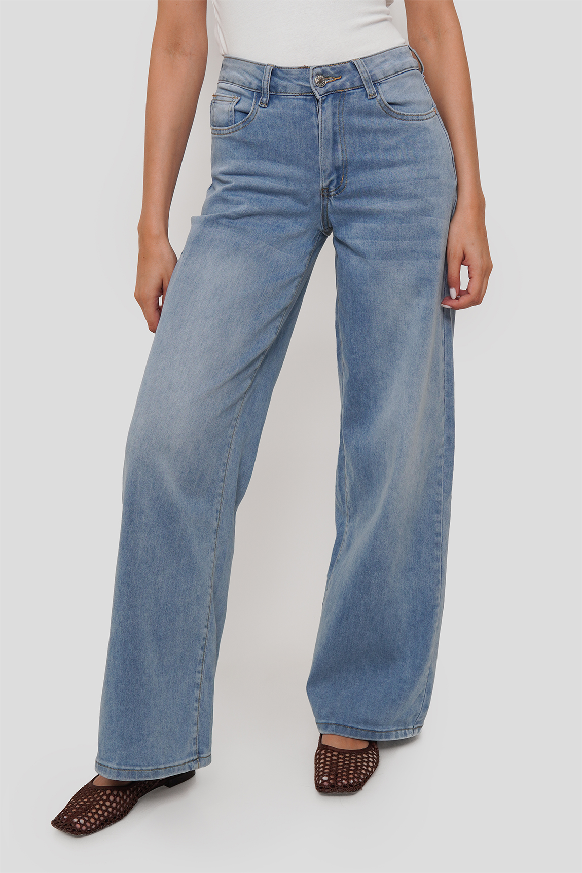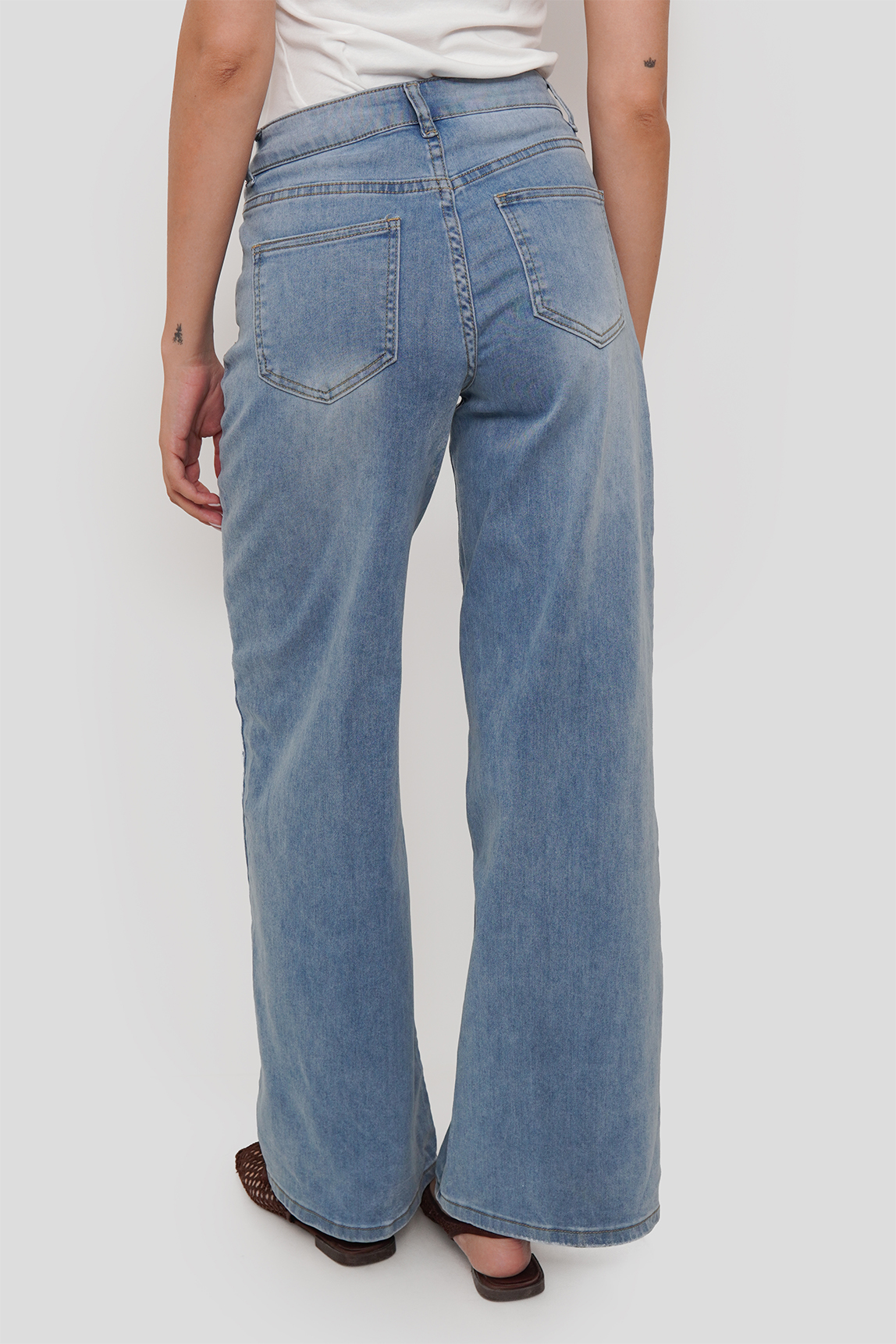 Jean de corte wide leg confeccionado en denim totalmente elasticado. Calce alto y cómodo, con diseño liso que estiliza la figura y combina con cualquier top o blusa.