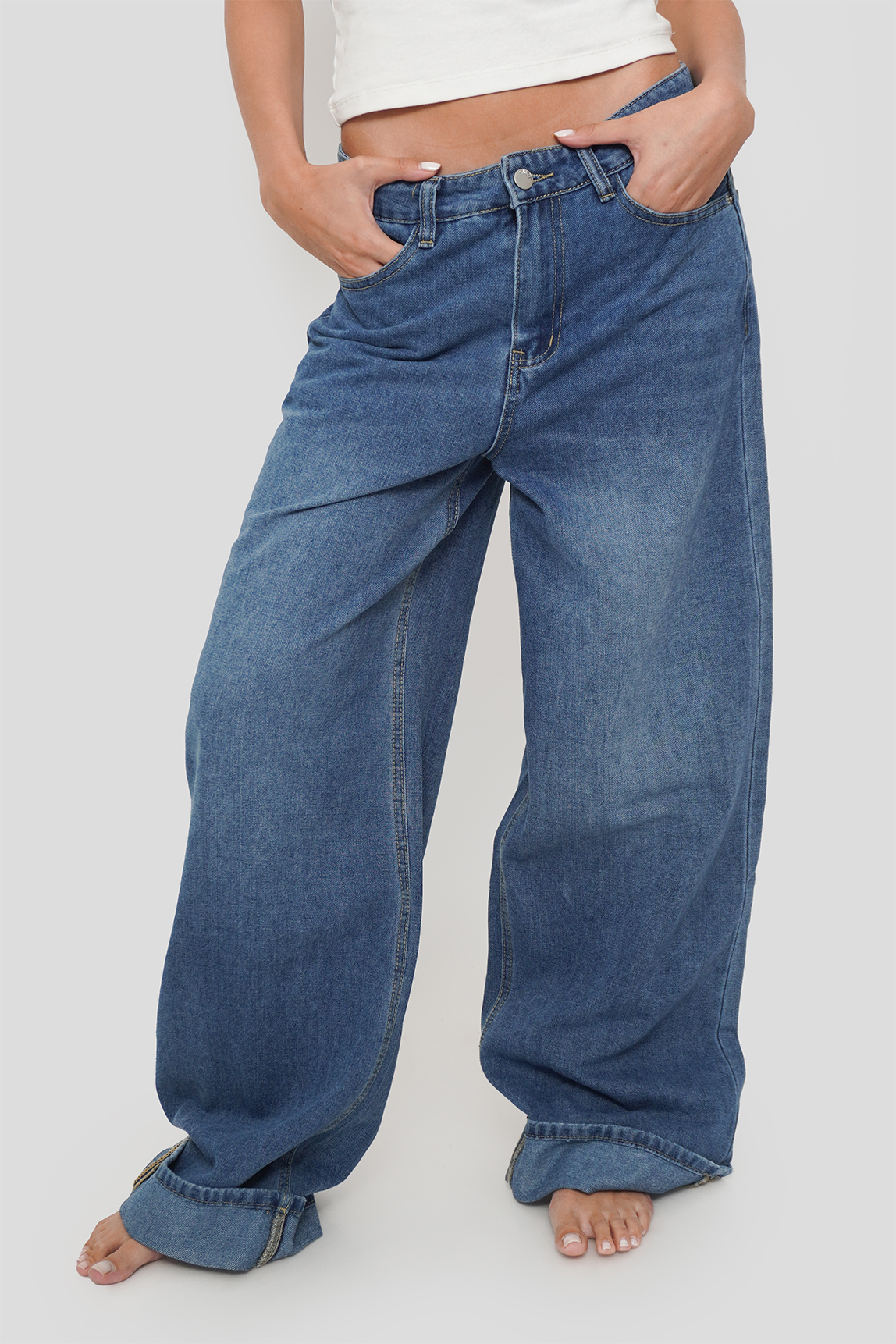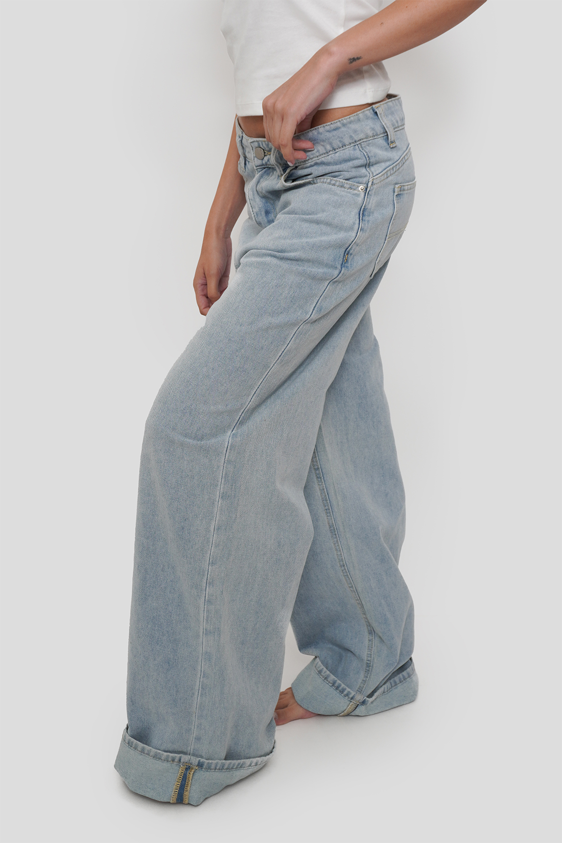 Pantalón tipo jeans de corte baggy con terminación doblada en bastas anchas. Disponible en lavado azul y gris deslavado, ideal para looks urbanos con inspiración retro. Un fit cómodo y moderno para todos los días.