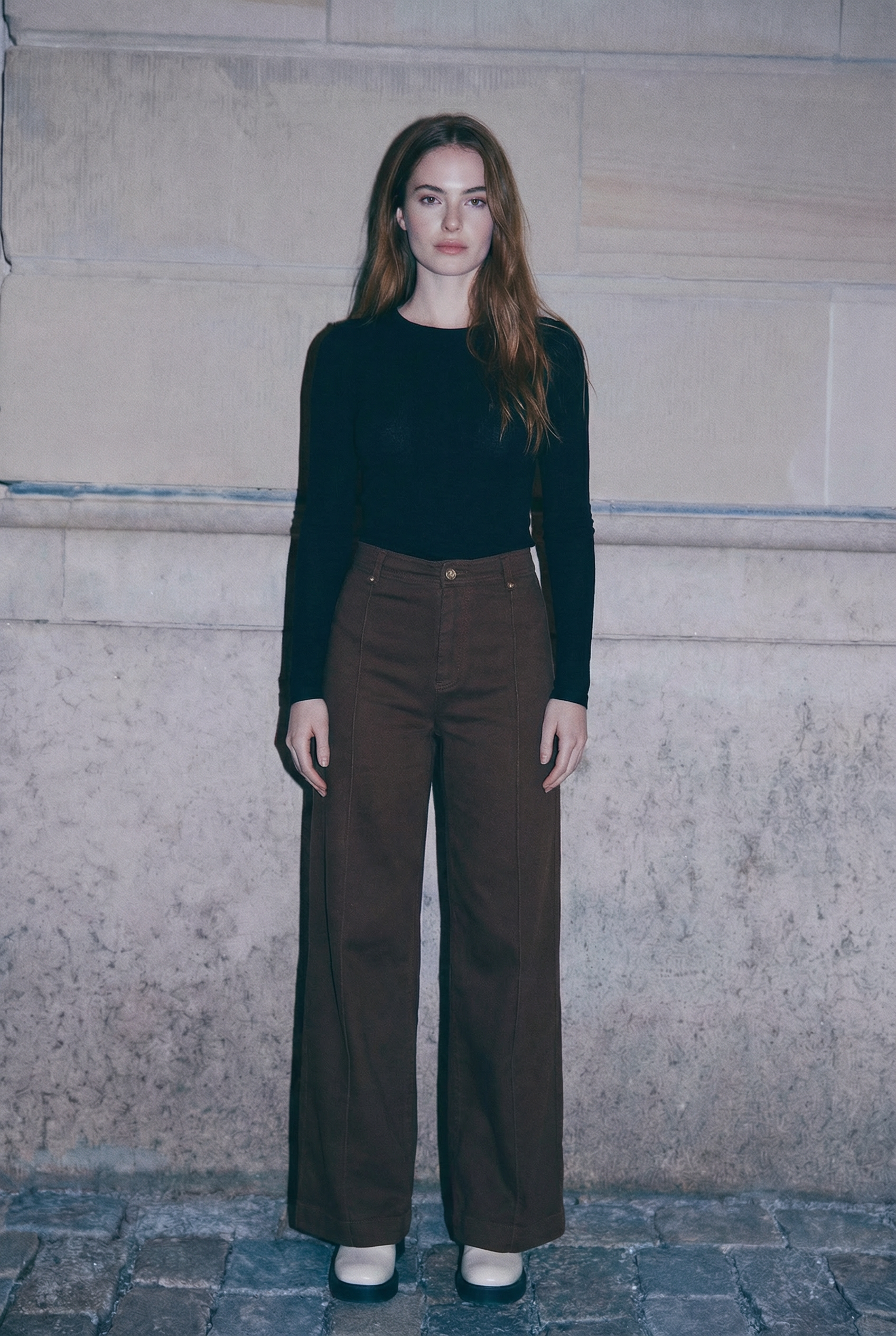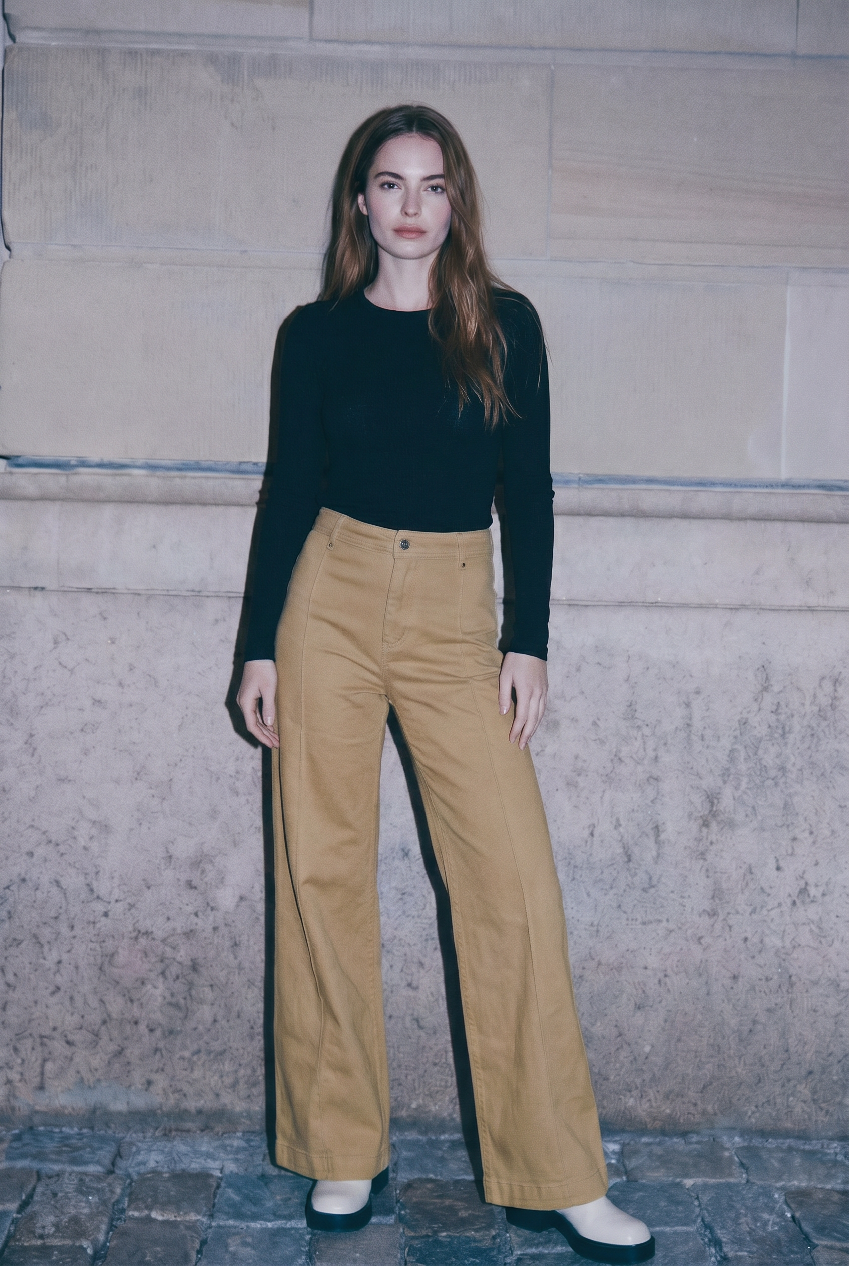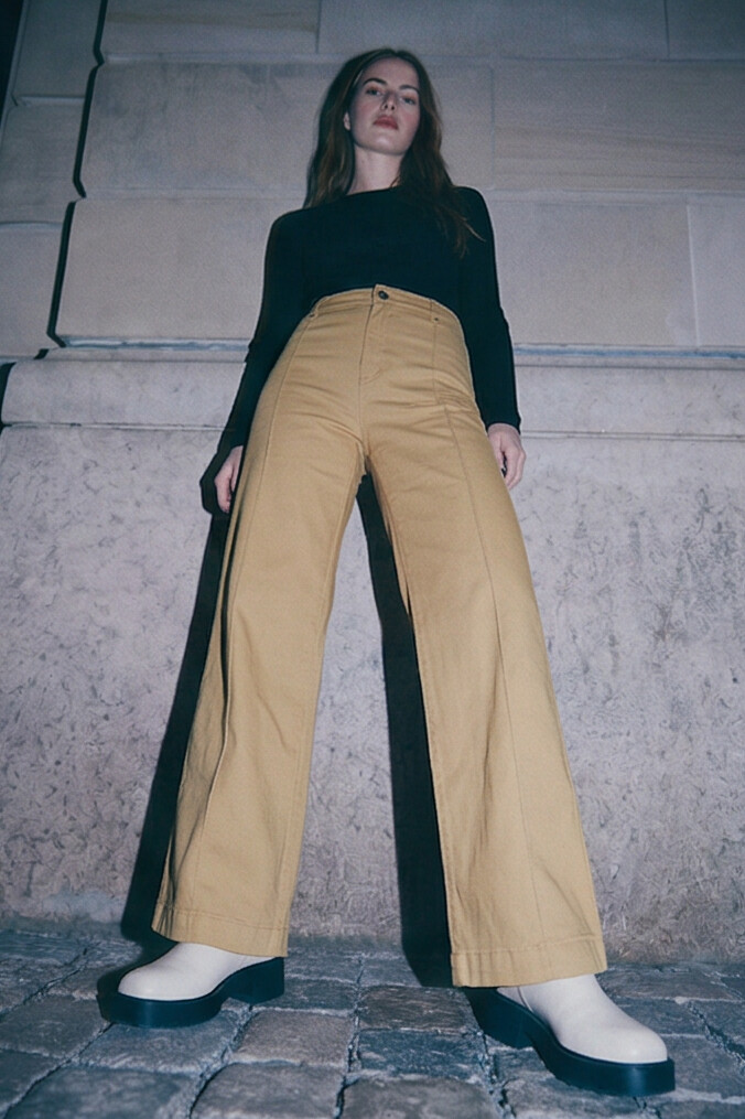 Jeans de calce wide leg y tiro alto, diseñados con tela elasticada que se adapta suavemente al cuerpo brindando máxima comodidad. Su diseño incluye costuras frontales reforzadas que estilizan la silueta, convirtiéndolos en el básico ideal para looks diarios con estilo y movimiento.