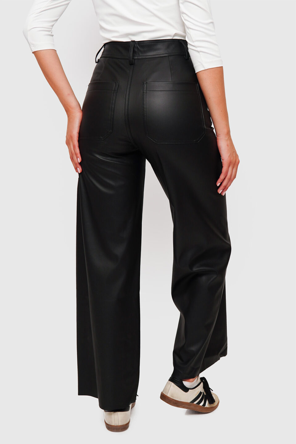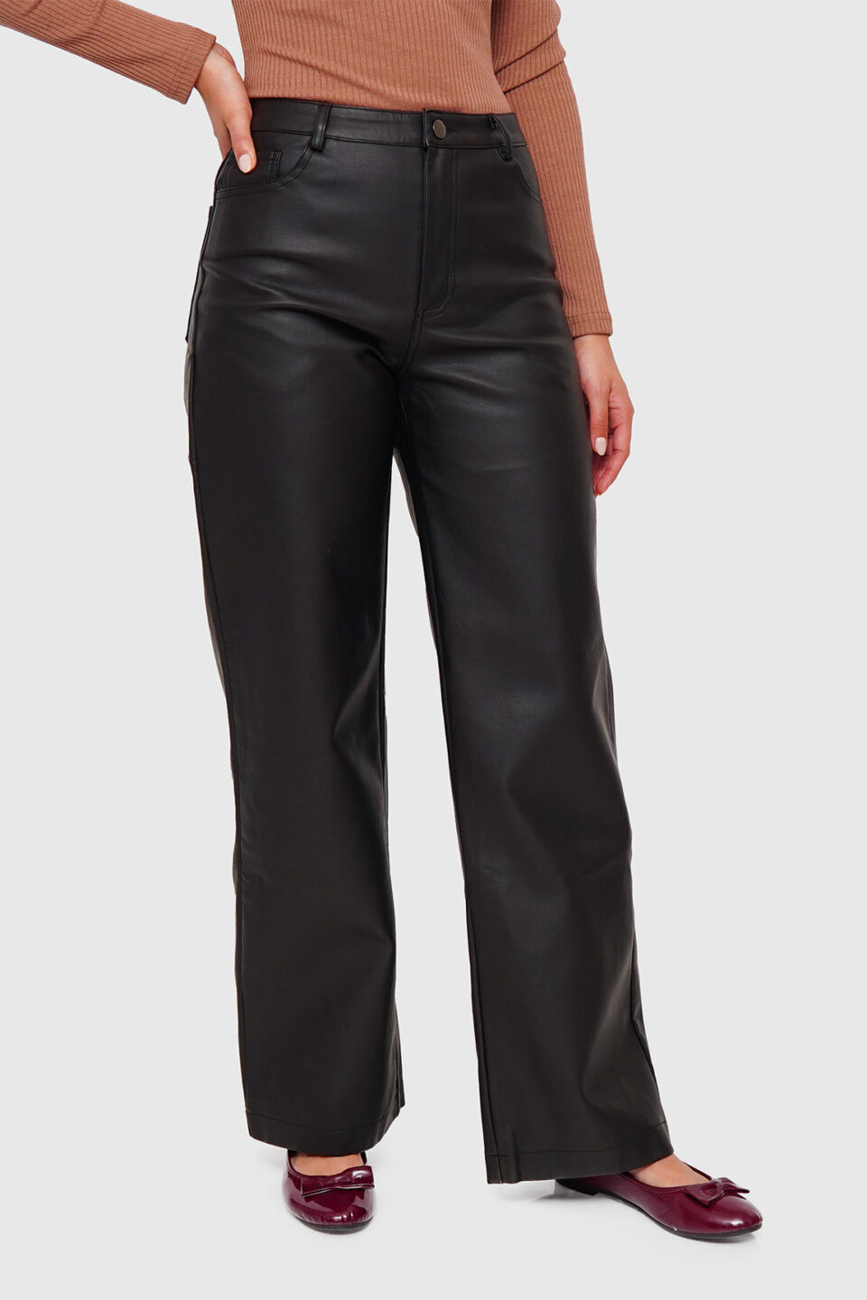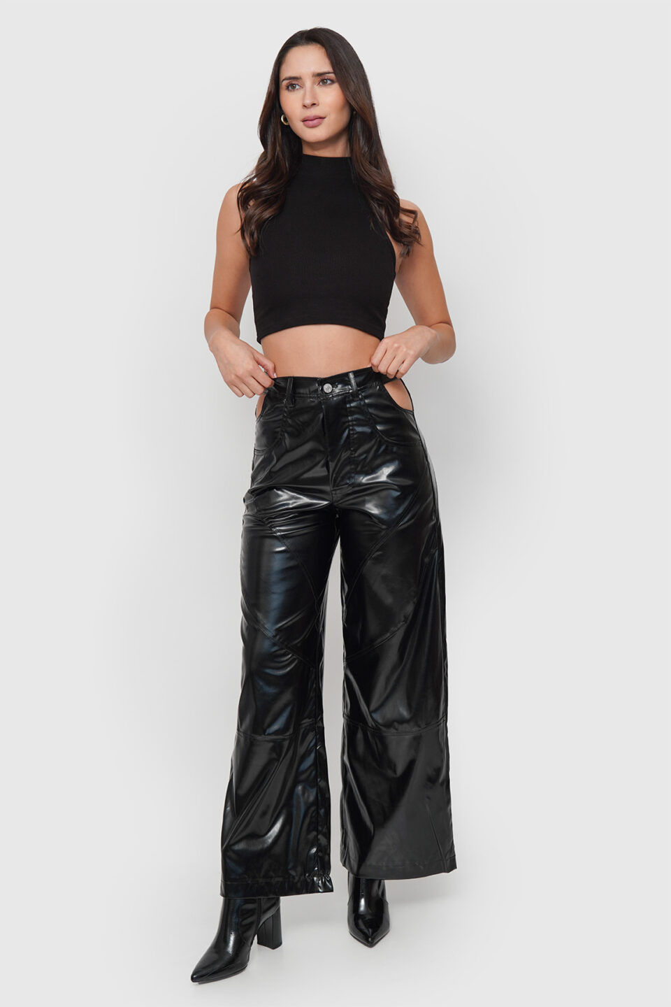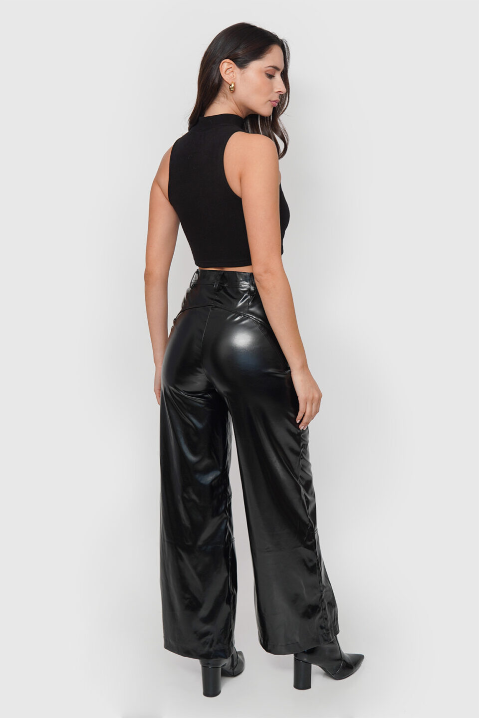 Pantalón ajustado con acabado engomado y detalle de abertura frontal en los tobillos. Perfecto para un look moderno y estilizado con un toque de brillo.