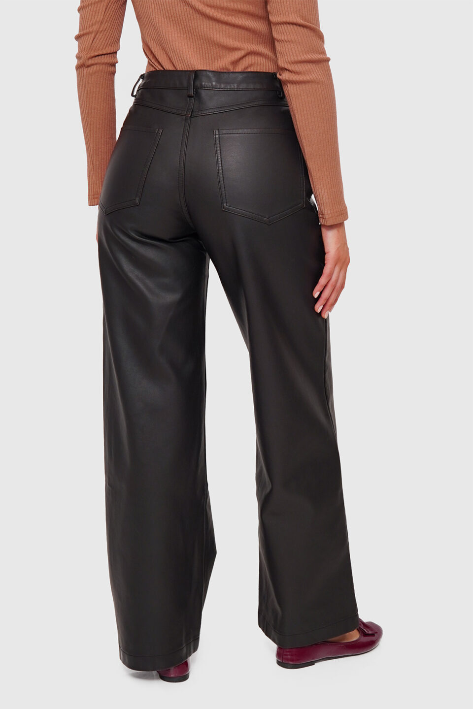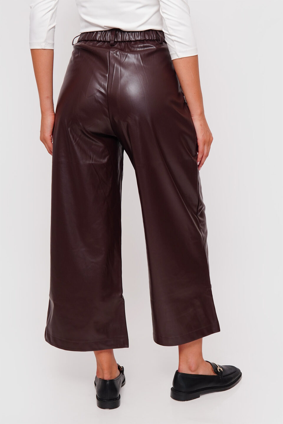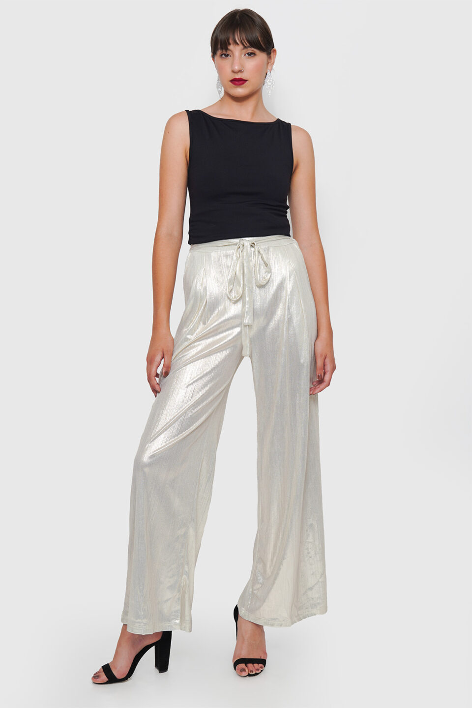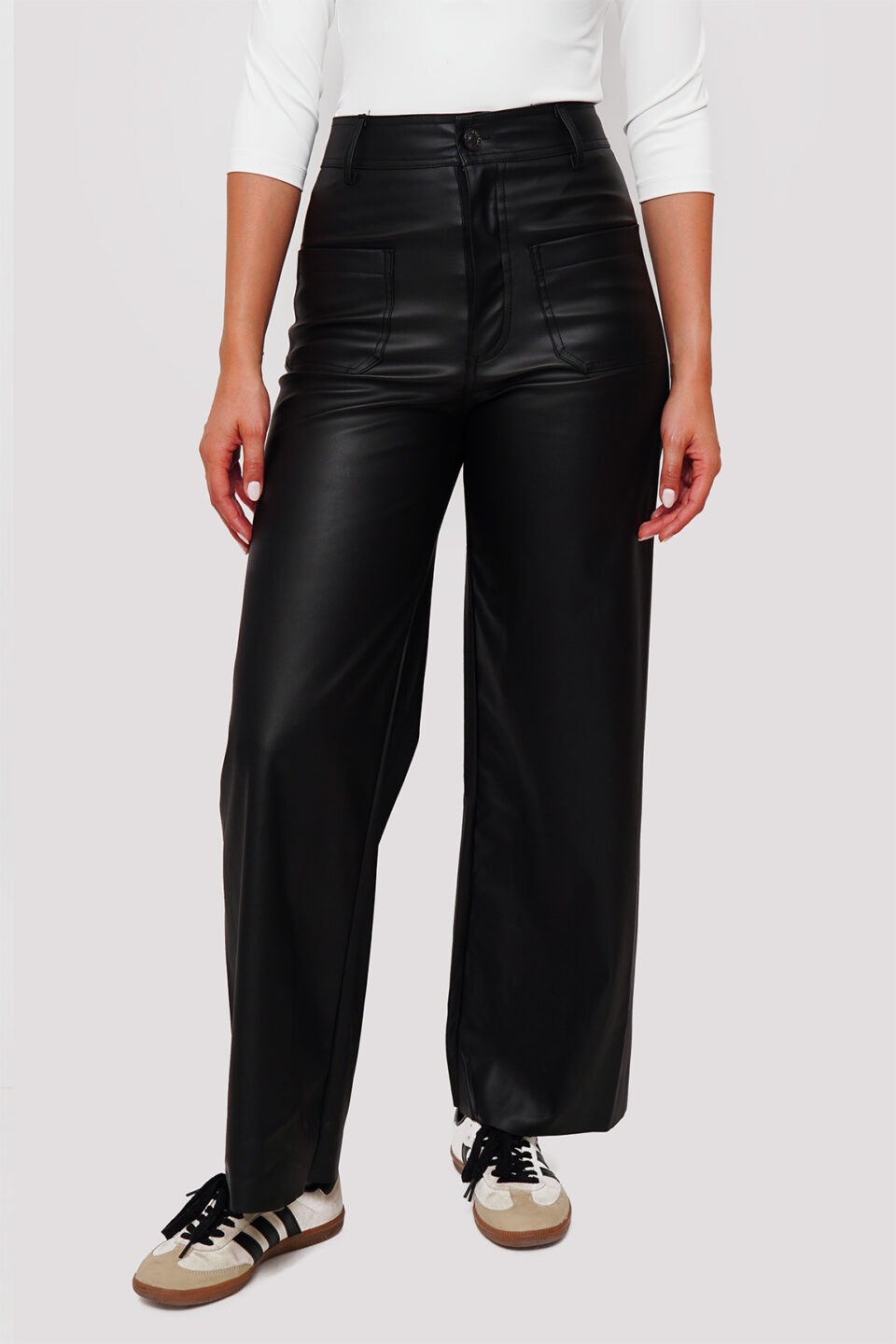 Pantalón ajustado con acabado engomado y detalle de abertura frontal en los tobillos. Perfecto para un look moderno y estilizado con un toque de brillo.