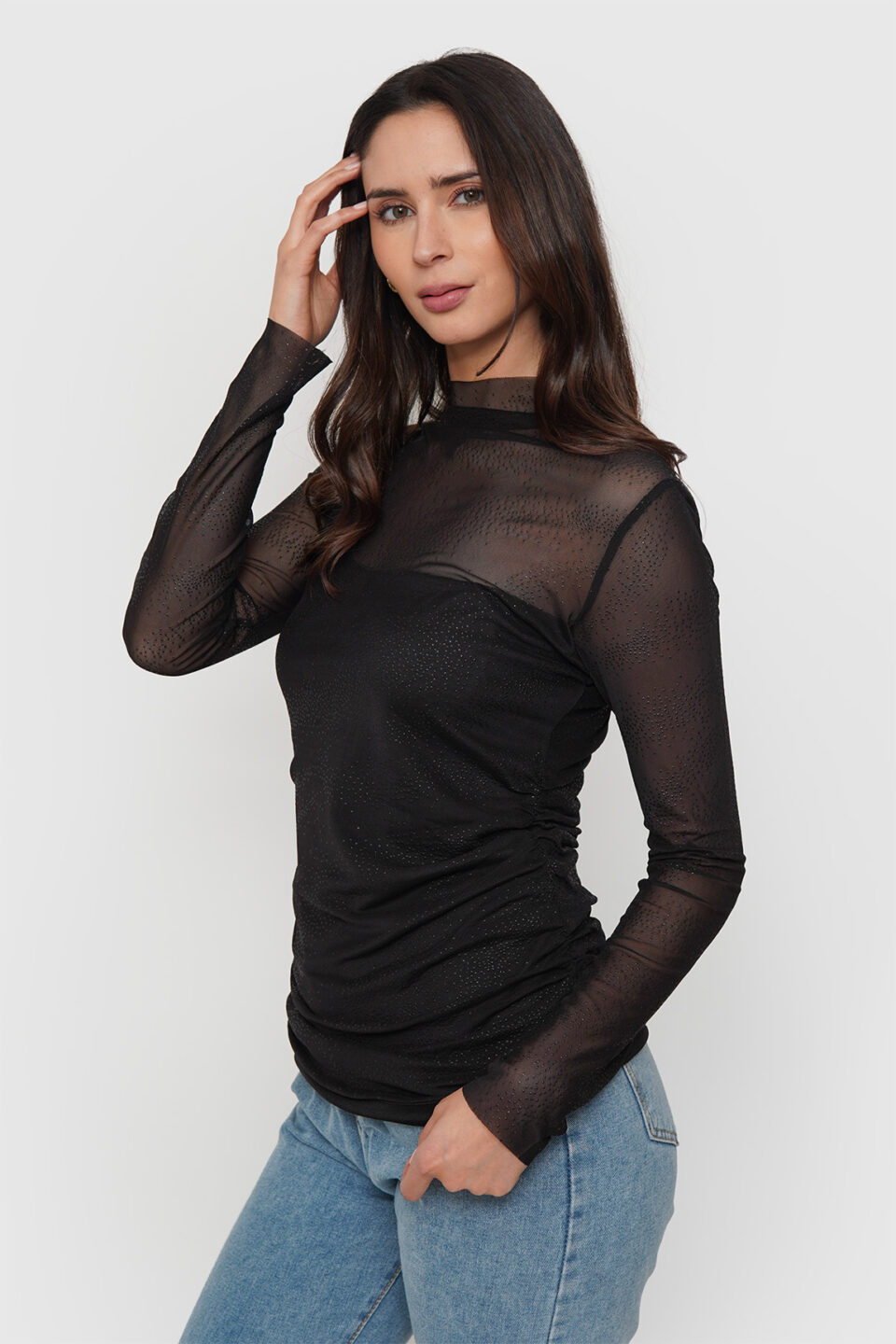 Destaca con esta polera de tejido lurex, ideal para darle un toque de brillo y sofisticación a tu look. Su diseño ajustado y el efecto metalizado la convierten en una prenda perfecta para eventos de día o de noche. Combínala con pantalones de ecocuero o faldas para un outfit moderno y chic.