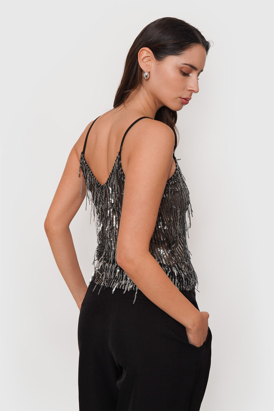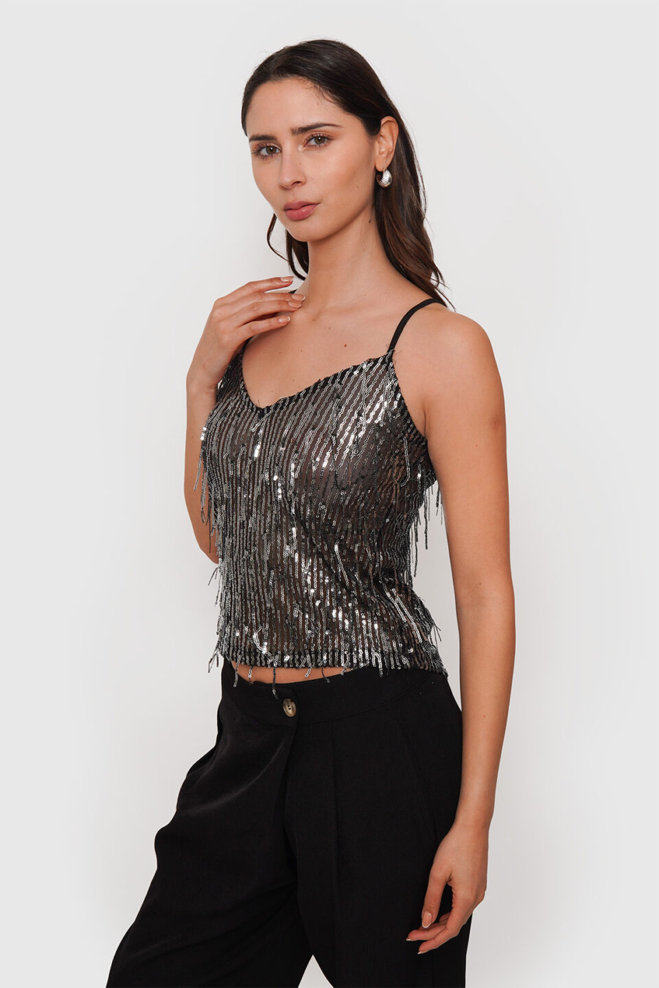 - Descripción: Top estilo halter con lazos decorativos y detalles en pedrería, aportando un toque sofisticado y elegante.