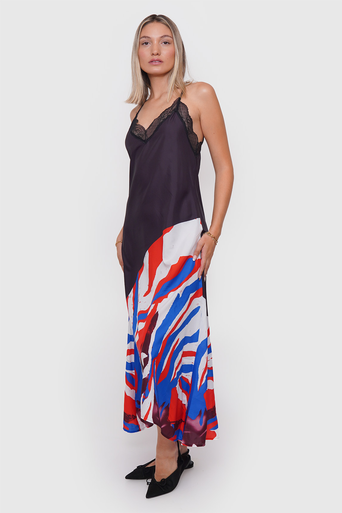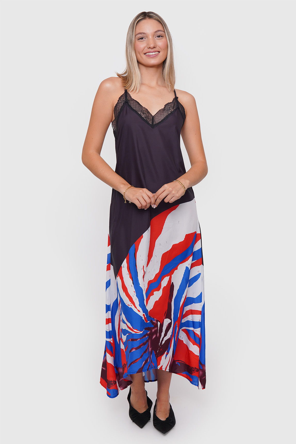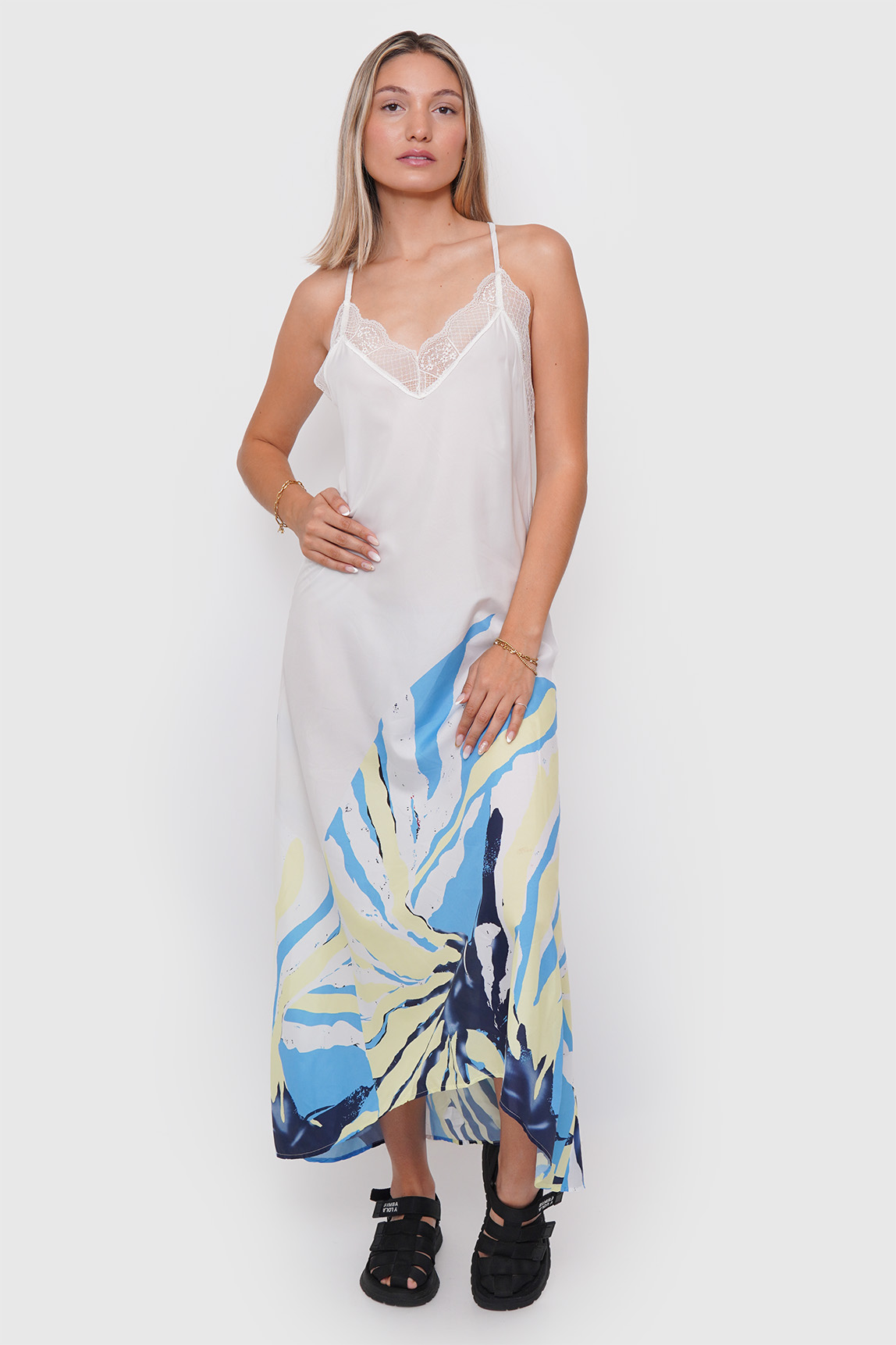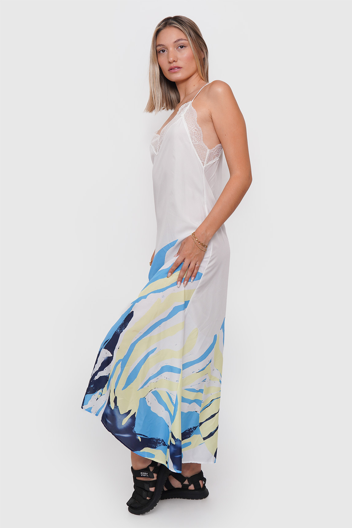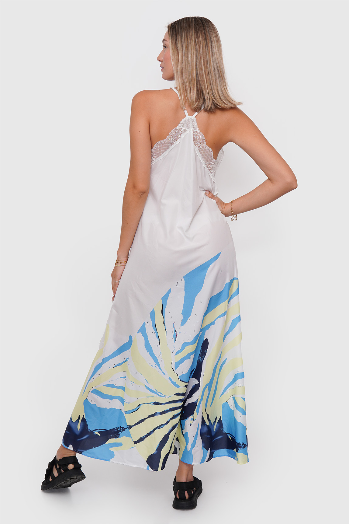 Vestido largo con tirantes finos y detalles de encaje en el escote. Diseño fluido con estampado tropical, ideal para un look fresco y veraniego con un toque elegante.